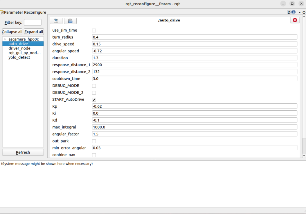 ## 1. 课程内容 **注意:这个程序是在沙盘地图上运行的,个人地图需要自行调整程序** 启动自动驾驶程序,在沙盘地图中使用车道保持居中自动驾驶功能 ## 2.运行案例程序 自动驾驶源码路径:`/home/jetson/yahboomcar_ros2_ws/yahboomcar_ws/src/auto_drive/auto_drive/auto_drive.py` ```启动相机节点 ros2 launch ascamera hp60c.launch.py ``` ```启动小车底盘 ros2 run yahboomcar_bringup Mcnamu_driver_M1 ``` ```启动车道线居中程序 ros2 run auto_drive auto_drive ``` 成功运行会出现一个可视化界面  启动成功之后正常小车会直接沿着沙盘车道线居中行驶,如果运行之后小车不动,可以根据下面的动态参数调节,看小车运行的参数有没有打开或者关闭(START_AutoDrive =True ,conbine_nav = False)之后车机会沿外圈的车道进行自动驾驶 * 在直线路段,会自动执行直线行驶和左右车道居中保持 * 在弯道路段会自动转向,出弯道后恢复车道保持模式  * 如果需要停车,取消勾选`START_AutoDrive`即可 * 启动动态参数配置节点 * ``` ros2 run rqt_reconfigure rqt_reconfigure ``` 可以通过实时调节上面参数来优化小车车道居中的效果  ☑️ 修改完参数,点击GUI空白处写入参数值。注意只会生效当次启动,永久生效需要将参数修改到源码当中。 🛠 参数解析: 【turn_radius】:转弯半径。正常不需要更改这个参数 【drive_speed】:线速度大小。小车的行驶速度,出厂默认是0.15,如果修改这个参数需要自行同步调试其他的参数 【angular_speed】:转弯角速度大小 【duration】:识别右转标志的右转时间, 【cooldown_time】:路标识别冷却时间 【DEBUG_MODE】:可视化debug参数,打开可能会影响居中效果 【START_AutoDrive】:控制小车运动参数,true为小车可运动 【kp、ki、kd】:小车居中pid参数 【conbine_nav】:路网导航+开启yolo才需要打开,打开之后小车会停止不动 **上面参数是主要调节优化参数,其他参数保持默认值** 中轴线调整 如果车道线保持过程中出现了小车提前转弯或者转弯过晚了,可以去调试中轴线来调试小车转弯的时机 参数路径: ``` /home/jetson/yahboomcar_ros2_ws/yahboomcar_ws/src/auto_drive/config/midline_points.yaml ``` ``` midline_points: start_point: x: 360 y: 477 end_point: x: 355 y: 424 midline_length: 120 mid_distance: [200,40] ``` 通过修改midline_length参数来调整小车的转弯时机,这里以120长度为例,如果转弯过早了,我们可以尝试将 120修改成115这样去调试,也可以通过相机的角度来调试轻轻往下掰一点点也会让转弯晚一点,具体根据实际环境去调试。修改完之后需要编译修改的内再去运行程序 ``` cd yahboomcar_ros2_ws/yahboomcar_ws/ ``` ``` colcon build --packages-select auto_drive ``` ## 3.源码解析 ### 3.1、auto_drive.py 程序源码位于`/home/jetson/yahboomcar_ros2_ws/yahboomcar_ws/src/auto_drive/auto_drive/auto_drive.py` **控制流程 (Control Flow)分为** 1. 接收并处理图像数据 2. 检测车道线和交通标志 3. 根据检测结果决定控制策略 4. 发布控制指令(速度、方向) 5. 循环执行以上步骤 ``` def __handle_lane_detect_result(self,left_box,right_box,frame): '''处理车道检测结果''' self.error_mode = 99 error_angular = [0.0, 0.0] # 默认角度偏差Default angle deviation if left_box is not None and right_box is not None and left_box[0]<right_box[0] : #如果左右车道线都存在,则绘制左右车道线和交点 self.error_mode=0 #标记误差模式,居中模式:0,左偏模式:1,右偏模式:2 frame=self.lane_detect.draw_left_line(frame, left_box)#绘制左车道线 frame=self.lane_detect.draw_right_line(frame, right_box)#绘制右车道线 frame,x_center,y_center=self.lane_detect.draw_center_point(frame,left_box,right_box)# 绘制车道估计中心点 left_lane_offset,right_lane_offset=self.lane_detect.cal_lane_lateral_offset(left_box,right_box) # self.get_logger().info(f"left_lane_offset: {left_lane_offset:.2f} , right_lane_offset: {right_lane_offset:.2f} ") error_angular=self.lane_detect.cal_error_angular(x_center,y_center)#计算车身与中心点的角度误差 elif left_box is not None and right_box is None and left_box[0]<320: self.error_mode=1 self.lane_detect.prev_center=None frame=self.lane_detect.draw_left_line(frame, left_box) elif right_box is not None and left_box is None : self.error_mode=2 self.lane_detect.prev_center=None frame=self.lane_detect.draw_right_line(frame, right_box) else: self.lane_detect.prev_center=None # 转向动作激活时,暂停车道线速度控制 if self.turn_action_active: return frame if self.error_mode==0 : #居中 if error_angular[1]>=0.03 or error_angular[1]<=-0.03: if abs(error_angular[1])<0.3: angular_z=self.pid_controller.pid_control(error_angular[1]) angular_z=min(angular_z,0.3) angular_z=max(angular_z,-0.3) self.__set_current_speed(linear_x=self.drive_speed,angular_z=angular_z) elif self.error_mode==1: #只有左边车道线 if_infer=self.lane_detect.IF_lane_intersection(left_box) if if_infer is not None: self.__set_current_speed(linear_x=self.drive_speed,angular_z=self.angular_speed) else: self.__set_current_speed(linear_x=self.drive_speed,angular_z=0.0) else: self.__set_current_speed(linear_x=self.drive_speed,angular_z=0.0) # 在图像上显示角度偏差 cv2.putText(frame, f"Angle Dev: {error_angular[1]:.2f} rad", (10, 90), cv2.FONT_HERSHEY_SIMPLEX, 0.8, (255, 0, 255), 2) frame=self.lane_detect.draw_midline(frame) return frame ``` 上面是关键车道线居中程序,根据左右黄色车道线和中轴线的斜率夹角来判断转弯实际以及居中行走的时机。