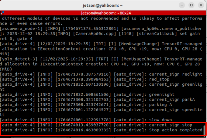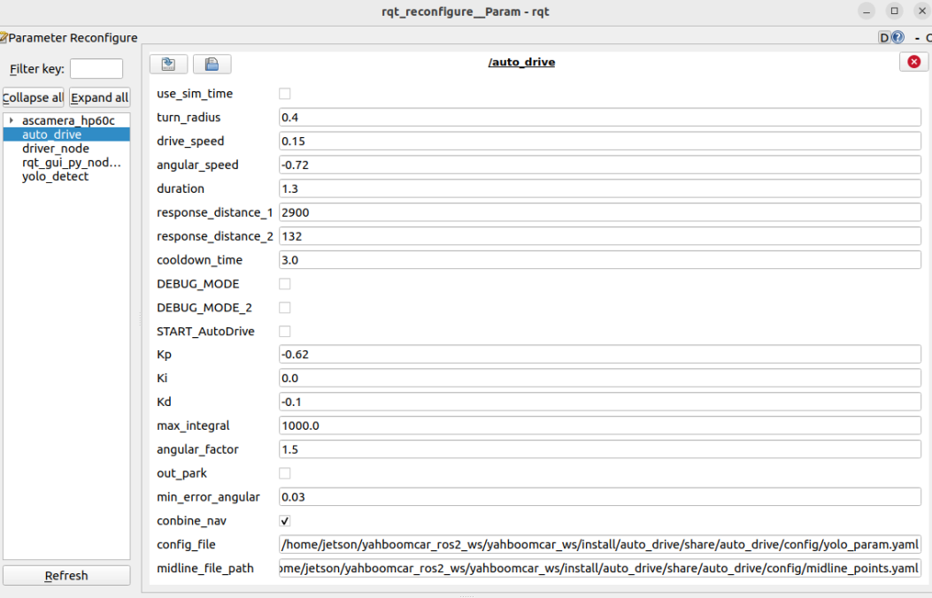 # 无人驾驶之定点停车 ## 1.课程内容 **注意:这个程序是在沙盘地图上运行的,个人地图需要自行调整程序** 1.学习小车识别到stop之后做的动作 2.学习新出现的关键源码 ### 2.停车检测 路标检测源码路径: `/home/jetson/yahboomcar_ros2_ws/yahboomcar_ws/src/auto_drive/auto_drive/yolo_detect.py` `/home/jetson/yahboomcar_ros2_ws/yahboomcar_ws/src/auto_drive/auto_drive/auto_drive.py` ### 3.程序启动 ```启动相机+底盘+路标、车道线 ros2 launch auto_drive auto_drive_bringup.launch.py ```  程序运行之后会显示yolo识别画面,小车会车道线居中运行,同时会根据行驶过程中识别到的路标做对应的动作。(如果开启程序之后终端没有报错,小车不动,可以运行下面程序来检查参数) 启动动态参数配置节点 ``` ros2 run rqt_reconfigure rqt_reconfigure ```   **如果小车不动检查两个参数,START_AutoDrive 是否勾上了,conbine_nav是否为flase** ☑️ 修改完参数,点击GUI空白处写入参数值。注意只会生效当次启动,永久生效需要将参数修改到源码当中。 ### 3.2 识别到停车之后小车的运动 程序识别到停车程序会打印stop  小车会定点停止三秒,之后重新沿着线行驶  定点停车处理函数在auto_drive.py文件下,下面是识别到停车之后进入的函数,用户可以自行修改识别到路标之后小车运动 ``` def stop(self): '''停止 stop''' self.turn_action_active = True # 设置动作标志,暂停车道线控制 self.__set_current_speed(linear_x=0.0, angular_z=0.0) time.sleep(3) self.turn_action_active = False # 清除动作标志,恢复车道线控制 self.get_logger().info('Stop action completed') ``` ## 4.源码解析 ### 4.1、auto_drive.py yolo路标消息接收: ``` def sign_callback(self, msg:DetectionObject): '''订阅yolo识别结果''' class_name = msg.class_name object_distance = self._get_distance(msg.ymin) # 计算距离 object = Object(msg.class_name, msg.confidence, object_distance) ``` 多重过滤机制:主要为了防止一直识别路标并触发,识别到不同路标才会解锁动作。 ``` # 1. 检查是否正在执行其他动作 if self.action_runing: return # 2. 检查冷却时间(防重复触发) current_time = time.time() if class_name in self.last_processed_time: time_diff = current_time - self.last_processed_time[class_name] if time_diff < self.cooldown_time: # 默认3秒冷却 return # 3. 检查是否是重复路标 if class_name == self.last_sign: return # 4. 检查该路标是否被使能 if not self.sign_enable_list[对应的索引]: return ``` 事件队列处理 ``` def handle_events(self): '''处理目标识别事件''' while True: if not self.event_queue.empty(): object = self.event_queue.get() self.action_runing = True current_sign = object.class_name try: # 根据路标类型执行相应动作 if object.class_name == "straight" and self.sign_enable_list[10]: self.go_straight() elif object.class_name == "turnright" and self.sign_enable_list[11]: self.turn('right') # ... 其他路标处理 finally: # 更新状态记录 self.last_processed_time[current_sign] = time.time() self.last_sign = current_sign self.action_runing = False ``` 具体动作实现 ``` def stop(self): '''停止 stop''' self.turn_action_active = True # 设置动作标志,暂停车道线控制 self.__set_current_speed(linear_x=0.0, angular_z=0.0) time.sleep(3) self.turn_action_active = False # 清除动作标志,恢复车道线控制 self.get_logger().info('Stop action completed') ```