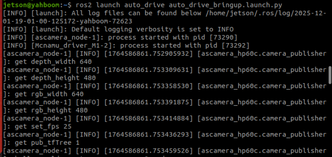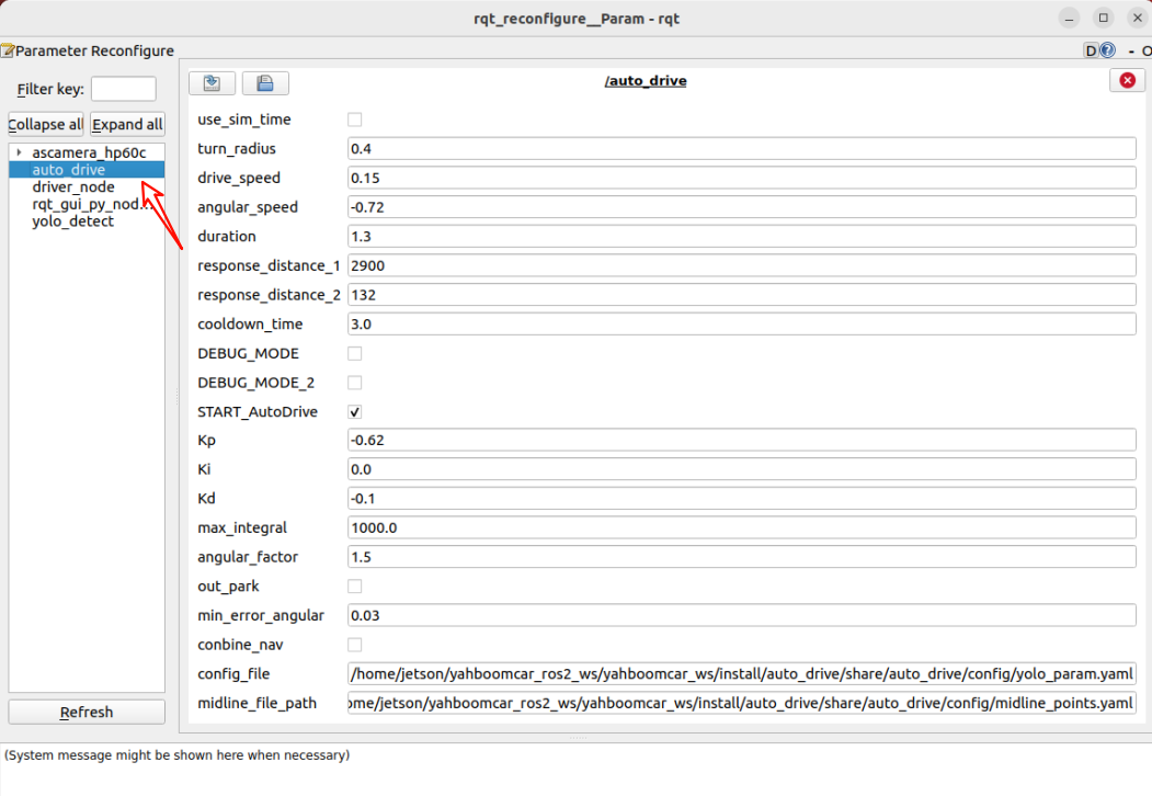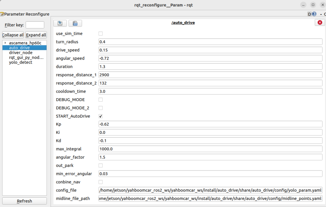 # 自动驾驶综合应用 ## 1.课程内容 **注意:这个程序是在沙盘地图上运行的,个人地图需要自行调整程序** 该教程使用的是出厂的路标模型和车道线识别模型,在沙盘地图上进行居中运动,同时识别到路标会做对应的路标函数动作。 ## 2. 程序路径 自动驾驶源码路径: 车道线保 `/home/jetson/yahboomcar_ros2_ws/yahboomcar_ws/src/auto_drive/auto_drive/auto_drive.py` 路标识别:`/home/jetson/yahboomcar_ros2_ws/yahboomcar_ws/src/auto_drive/auto_drive/yolo_detect.py` ## 3.运行案例程序 ### 3.1 运行程序 * 启动相机+底盘+路标车道线 ``` ros2 launch auto_drive auto_drive_bringup.launch.py ```  程序运行之后会显示yolo识别画面,小车会车道线居中运行,同时会根据行驶过程中识别到的路标做对应的动作。(如果开启程序之后终端没有报错,小车不动,可以运行下面程序来检查参数)  * 启动动态参数配置节点 ``` ros2 run rqt_reconfigure rqt_reconfigure ```  **如果小车不动检查两个参数,START_AutoDrive 是否勾上了,conbine_nav是否为flase** ☑️ 修改完参数,点击GUI空白处写入参数值。注意只会生效当次启动,永久生效需要将参数修改到源码当中。 🛠 参数解析: 【turn_radius】:转弯半径。正常不需要更改这个参数 【drive_speed】:线速度大小。小车的行驶速度,出厂默认是0.15,如果修改这个参数需要自行同步调试其他的参数 【angular_speed】:转弯角速度大小 【duration】:识别右转标志的右转时间, 【cooldown_time】:路标识别冷却时间 【DEBUG_MODE】:可视化debug参数,打开可能会影响居中效果 【START_AutoDrive】:控制小车运动参数,true为小车可运动 【kp、ki、kd】:小车居中pid参数 【turn_radius】:转弯半径。正常不需要更改这个参数 【conbine_nav】:路网导航+开启yolo才需要打开,打开之后小车会停止不动 ### 3.2 识别到路标之后小车的运动 * 直行 * 按照设定的速度进行行驶,也可以在被停车标识之后停止后恢复行驶 * 右转 * 触发右转的固定动作 * 鸣笛 * 触发汽车鸣笛音效 * 人行道 * 触发汽车鸣笛音效、减速1秒 * 限速 * 汽车减速行驶3秒,然后恢复正常速度 * 学校 * 触发汽车鸣笛音效、减速行驶1秒 * 停车场A、B * 触发预设的固定泊车动作 * 红绿灯 * 红灯 * 不结合路网规划时,触发解除车道保持自动驾驶状态 * 结合路网规划时,取消正在执行的导航任务 * 绿灯 * 不结合路网规划时,触发激活车道保持自动驾驶状态 * 结合路网规划时,恢复到上一个导航任务 下图是右转和停车位置固定位置,因为程序采用了固定动作所以要效果好建议是放到这个位置,如果需要放到其他的位置需要重新去调试固定动作时间 。  ### 3.3 调试参数 这里分为两种调试参数的方案,一种是临时实时调试,一种是永久修改参数调试 * 临时实时调试 运行程序之后运行动态调参指令去调试: ``` ros2 run rqt_reconfigure rqt_reconfigure ```  **调试经验:** 1. 如果车道居中保持不稳定可以去看《4.无人驾驶之车道保持》章节 2. 识别右转,转弯不够或者转弯过头可以调节duration这个参数来控制右转弯时间 3. 防止频繁识别路标,修改cooldown_time路标冷却,表示识别路标之间的冷却时长 4. 车道居中调整过慢,调大kp。 * 永久修改参数调试 通过修改参数文件来达到永久修改参数,参数路径 ``` /home/jetson/yahboomcar_ros2_ws/yahboomcar_ws/src/auto_drive/config/auto_drive_node.yaml ``` ``` /home/jetson/yahboomcar_ros2_ws/yahboomcar_ws/src/auto_drive/config/yolo_param.yaml ``` ``` /home/jetson/yahboomcar_ros2_ws/yahboomcar_ws/src/auto_drive/config/midline_points.yaml ``` 三个参数分别表示:自动驾驶参数、路标识别参数、车道线居中参数 **自动驾驶参数:** ``` auto_drive: ros__parameters: turn_radius: 0.4 drive_speed: 0.15 angular_speed: -0.72 duration: 1.3 response_distance_1: 2900 response_distance_2: 132 cooldown_time: 3.0 DEBUG_MODE: False START_AutoDrive: True conbine_nav: False Kp: -0.62 Ki: 0.0 Kd: -0.1 max_integral: 1000.0 image_size: [640, 480] ``` 上面参数和动态调节参数的意义是一样,这里修改之后下次运行默认调用这里的程序,启动需要注意的是START_AutoDrive: True和conbine_nav: False,这两个参数决定小车能不能运行。conbine_nav: False参数之后使用路网导航+自动驾驶的前提才需要打开。 **路标识别参数:** ``` #路标检测推理参数 sign_detection: model_path: '/home/jetson/yahboomcar_ros2_ws/yahboomcar_ws/src/auto_drive/tools/sign_model.engine' conf: 0.92 #设置检测的最小置信度阈值。 将忽略置信度低于此阈值的检测到的对象。 调整此值有助于减少误报。 iou: 0.7 #用于非极大值抑制 (NMS) 的重叠阈值。较低的值会通过消除重叠的框来减少检测结果 rect: True #如果启用,则对图像较短的一边进行最小填充,直到可以被步长整除,以提高推理速度。 half: True #如果启用,则使用半精度推理,可以加快在支持的 GPU 上的模型推理速度,同时对准确性的影响极小。 device: "cuda:0" #推理设备 batch : 50 #批处理大小,更大的批处理大小可以提供更高的吞吐量,从而缩短推理所需的总时间。 max_det : 4 #最多检测的物体数 augment : False #启用测试时增强 (TTA) 进行预测,可能会提高检测的鲁棒性,但会降低推理速度。 verbose : False #是否在终端输出推理的详细信息。 classes : [0, 1, 2, 3, 4, 5, 6, 8, 9, 10, 11, 12, 13] line_detection: #车道线检测推理参数 model_path: '/home/jetson/yahboomcar_ros2_ws/yahboomcar_ws/src/auto_drive/tools/lane_V6.engine' conf: 0.5 #设置检测的最小置信度阈值。 将忽略置信度低于此阈值的检测到的对象。 调整此值有助于减少
