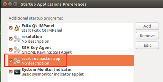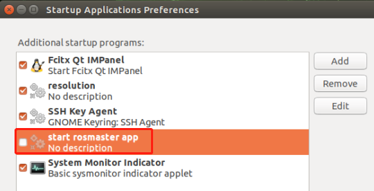 ## 1、什么是开机自启动大程序 为了能够方便体验小车的APP功能,系统中增加了一个程序,此程序集合了APP的控制功能和玩法,所以称做“大程序”,而且在主板系统开机时,此程序会自动启动,所以称做“开机自启动大程序”。 开机自启动大程序只是为了方便体验手机APP功能,在实际开发中,是需要将大程序关闭的,否则会占用设备,造成不可预估错误。所以开发程序前,请先手动关闭开机自启动大程序。 关闭开机自启动大程序有两种方式,一种是只关闭一次,下次开机它还会自动启动,叫做**临时关闭**,另一种方式是关闭后下次开机不会再自动启动,除非手动重新开启,叫做**永久关闭**。 ### 1.2、临时关闭大程序 使用同一局域网内的电脑打开VNC Viewer软件远程登录桌面的方式进入桌面。 进入桌面后看到有一个终端,直接点击左上角的X符号关闭终端即可关闭大程序。有时候可能会提示关闭终端会关闭正在运行的程序,选择确认关闭就可以。  ### **2.3、永久关闭大程序** 先按照临时关闭的方式操作关闭正在运行的大程序。 再打开Ubuntu系统的应用程序,搜索Startup Applications,将start_rosmaster_app前面的勾去掉,如下图所示,即可永久关闭大程序。  ### 2.4、设置开机启动大程序 在打开Ubuntu系统的应用程序,搜索Startup Applications,将start_rosmaster_app前面的方格打上勾,如下图所示,则下次系统开机就会自动启动大程序。  ### 2.5、临时启动大程序 如果需要手动运动大程序,请先打开Ubuntu的终端,然后输入以下命令: ``` python3 /home/jetson/Rosmaster-App/rosmaster ```