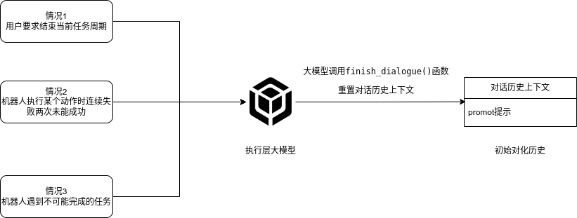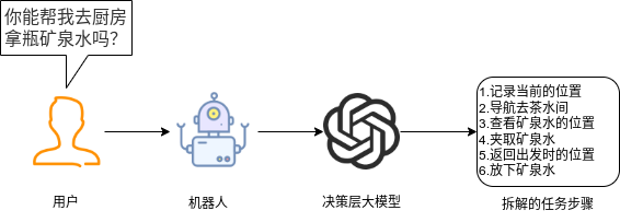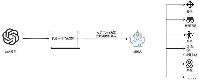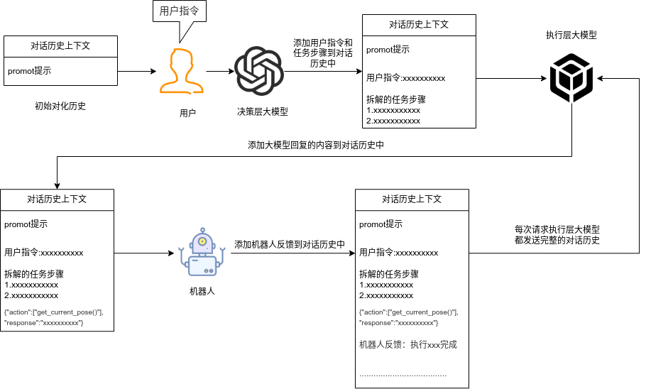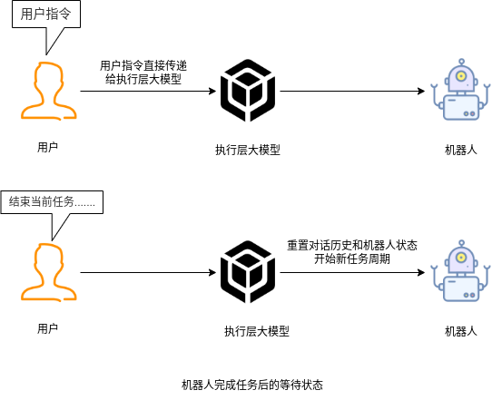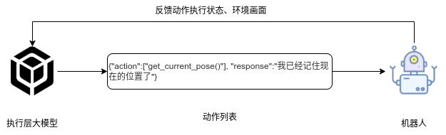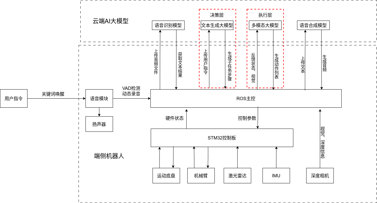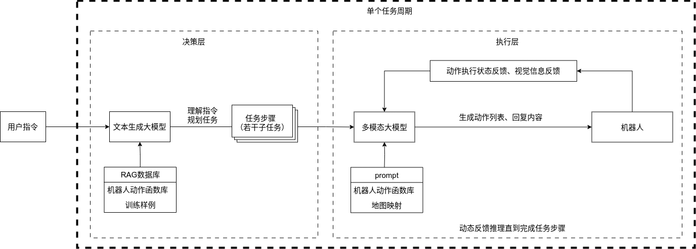 ## 名词解释:具身智能是人工智能与机器人学交叉的前沿领域,强调智能体通过身体与环境的动态交互实现自主学习和进化,其核心在于将感知、行动与认知深度融合。具身智能领域蕴含着巨大的市场潜力和发展机遇,随着技术的不断成熟、应用的不断拓展,具身智能产品将在智能制造、智能家居、智慧医疗、智能服务等多个领域发挥重要作用。在技术方面要通过优化算法、提高硬件性能等方式,采用加密技术、数据脱敏等手段保护用户数据安全和隐私。此外也要制定具身智能技术伦理和道德准则加强对具身智能技术的监管和评估确保其行为符合人类道德和价值观。 具身智能的基本原理之一是身体和智能相互依存 。智能体的身体形态不仅限制了其在环境中的行动能力,也在一定程度上塑造了智能体的认知方式。这一观点认为,智能并非仅仅存在于“头脑”中,而是通过智能体的身体及其在环境中的互动表现出来的。身体在环境中的感知、反馈和适应使智能体能够更灵活地应对复杂任务,因此,身体的形态和运动方式直接影响智能体的认知和决策过程。 ## 1.课程内容 1.讲解AI具身智能机器人的大模型推理架构 2.对系统中的基础概念进行讲解,为后续课程实操做好铺垫 ## 2.系统组成  ## 3. AI大模型推理架构图 机器人在程序设计上采用**双模型推理**、**动态反馈推理**的设计,提高了机器人在面对长流程复杂任务时的处理能力,相比单模型架构具备更强的系统鲁棒性。这里有几个关键的概念:决策层大模型、执行层大模型、任务周期、对话历史,在下文中将进行逐个讲解。  ## 4. 大模型推理架构讲解 ### 4.1 双模型架构原理 1、机器人的大模型控制系统基于文本生成大模型和多模态大模型设计,其中文本生成大模型作为**决策层**,其作用是作为上层的任务规划器,对复杂、抽象的人类指令进行任务分解 2、多模态大模型作为执行层,其作用是接收**决策层**生成的任务步骤以及用户的**临时指令**(一般是一些要求机器人结束任务、休息的简单指令)、监督机器人执行任务的进度并实时进行调整执行动作,生成机器人能解析的动作函数列表以及对用户的回复 3、其中,动作函数列表中是已编写好的基础动作函数,能够直接输出控制机器人运动的参数。 ### 4.2 双模型推理架构的优势 #### 4.2.1 决策逻辑与动作控制解耦 1、多模态大模型在对自然语言语义理解、逻辑推理的能力上差于文本生成大模型,并且在执行复杂任务时容易出现模态干扰,因此在系统设计上将决策逻辑与动作控制进行解耦。 2、文本生成大模型专注于语义理解与任务规划(如解析 “你能帮我取房间A中的蓝色方块吗?” 拆分任务步骤为 “记录当前的位置→导航至房间A→获取当前机器人视角图像→定位蓝色方块坐标→抓取蓝色方块→返回出发时的位置→放下蓝色方块 ),避免传统单模型在语义解析时需同时处理动作细节的复杂性。 3、多模态大模型负责动作生成与环境交互(如获取视觉图像定位出物体坐标,输出动作函数和参数),减少单模型因任务复杂导致的动作逻辑混乱,偏差较大的情况。 #### 4.2.2 降低模型训练样本复杂度 使用单一模型方式推理时,多模态大模型需同时进行 “自然语言理解 + 环境感知 + 流程拆解+动作函数输出”,易出现**模态干扰**(语言歧义或指令过长导致理解错误)。双模型通过分阶段处理,使决策层专注语言空间映射,执行层专注视觉 - 运动空间映射。 #### 4.2.3 灵活扩展 决策层和执行层大模型可在阿里百炼大模型平台(有时也称通义千问平台)选用多种大模型灵活搭配,通过自定义的训练样本和RAG知识库,可以使模型适应不同场景下的任务,极大增加了AI具身智能机器人在不同场景下的泛化能力。 ### 4.3决策层大模型 #### 4.3.1 决策层模型作用 1、机器人的决策层大模型默认使用学校的大模型。 2、决策层大模型主要负责任务规划,它可以理解复杂的人类指令并将其分解为具体的任务步骤。例如,当接收到指令“你能帮我去厨房拿瓶矿泉水吗?”,大语言模型会将其拆解为几个任务,如下图所示。 3、每个任务步骤对应机器人能完成的最小动作,再由执行层大模型通过调用这个机器人的动作函数库中的API函数来实现具体的机器人运动。  #### 4.3.2 机器人动作函数库(简化)——NUWA深度相机 机器人动作库中规定了所有机器人能够实际执行的最小动作,决策层模型在规划任务步骤时,会从中选取合适的动作进行排列组合 基础动作类 左转x度 #### 右转x度 #### 前进x米 #### 后退x米 #### 左移x米 #### 右移x米 导航移动类 **导航到x点** 相近语义:去x点、到x点、请你去x点。 **返回初始位置** 相近语义:回到初始位置、返回起点。 **记录当前位置** 深度相机类 **开始人脸跟随** 相近语义:开始xx跟随。 **开始巡线自动驾驶** 相近语义:开机xx巡线驾驶。 获取图像类 **获取当前视角图像** 说明:调用后机器人上传一张640×480像素的俯视图像,用于物体定位。 其他函数 **结束当前任务周期** 说明:清空上下文,结束任务(如用户指令“退下”“休息”)。 **等待一段时间** 说明:暂停x秒(x为等待时间,单位:秒)。 ### 4.4 执行层大模型 1、机器人的执行层大模型默认使用学校的大模型。 2、执行层大模型主要负责生成控制机器人行动的动作列表以及对用户的回复,在机器人执行动作列表过程中,不断接收来自机