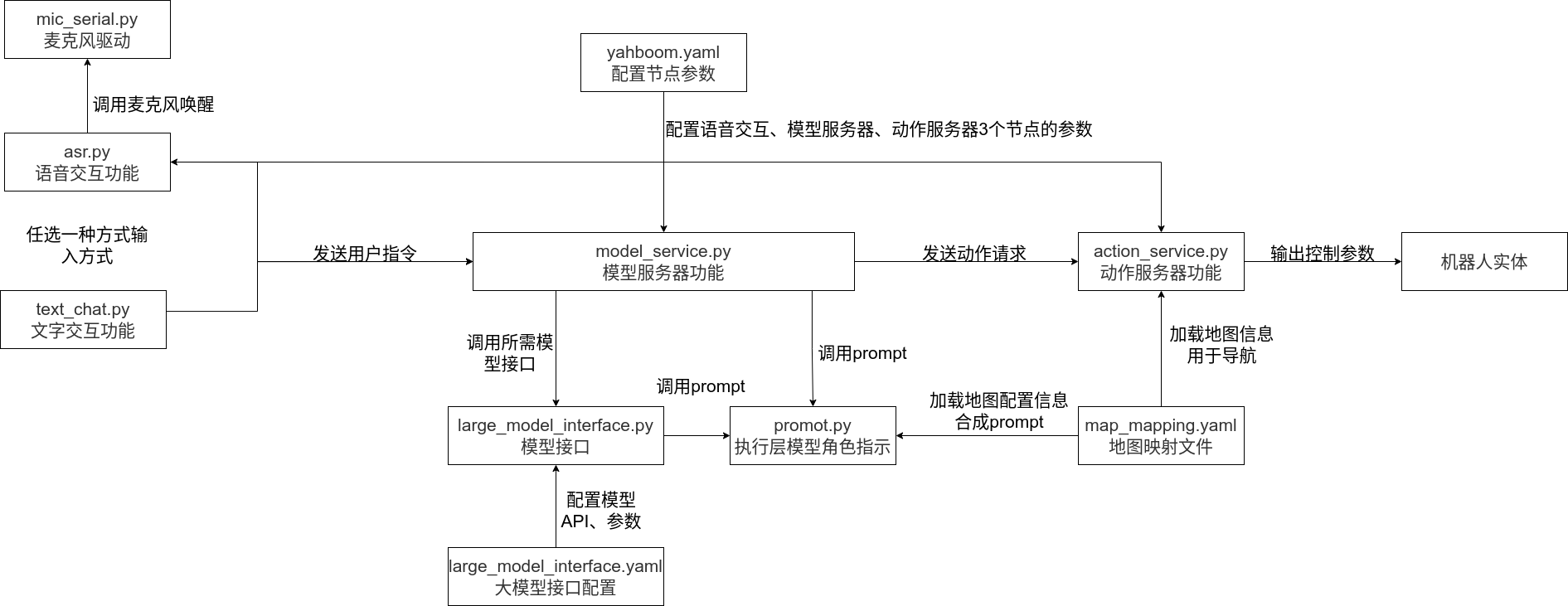 ## 具身智能玩法核心源码解读 ### 1.课程内容 1.AI大模型具身智能玩法是一个复合功能,涉及多个节点程序的配合实现,本节课程对核心的程序进行讲解。 ### 2.源码功能包结构 #### 2.1 功能包文件结构 AI大模型具身智能的ros功能包为largemodel,功能包路径为: jetson orin nano 主机: `/home/jetson/yahboomcar_ros2_ws/yahboomcar_ws/src/largemodel` 功能包文件结构如下:  **文件夹和文件作用说明如下**: **2.1.1 config** 配置文件夹,存放配置文件 large_model_interface.yaml 大模型接口配置文件,用于配置各个平台的API-KEY、大模型参数 map_mapping.yaml 地图映射文件,用于建立栅格地图与现实世界中区域的映射关系 yahboom.yaml 节点配置文件:用于配置核心节点的参数 **2.1.2 largemodel** 源码文件夹,AI大模型具身智能玩法核心程序 asr.py 语音识别程序文件,用于运行语音识别模型,与用户进行交互 model_service.py 模型服务器程序文件,用于调用各种模型接口实现模型推理架构 action_service_usb.py usb相机动作服务器程序文件,用于接收模型服务器请求的动作列表,控制机器人进行运动并播放声音 action_service_nuwa.py 深度相机动作服务器程序文件,用于接收模型服务器请求的动作列表,控制机器人进行运动并播放声音 **2.1.3 launch** 2.1.3 launch 启动文件文件夹,用于存放ros2节点启动文件 largemodel_control.launch.py AI大模型具身智能玩法的启动文件:启动多个节点,有语音交互模式、文字交互模式两种启动方式 **2.1.4 resources_file** 存放系统声音的音频文件 **2.1.5 utils** 组件文件夹,存放非核心功能的程序文件 large_model_interface.py 大模型接口程序文件,包含了各个平台调用大模型的底层接口,不同平台不同模型的调用程序不相同,在接口文件中统一管理调用方式 mic_serial.py 语音模块驱动程序文件,用于驱动语音模块的的唤醒词功能 promot_usb.py usb相机版大模型prompt提示词文件:用于生成执行层大模型的提示词的文件 promot_nuwa.py 深度相机版大模型prompt提示词文件:用于生成执行层大模型的提示词的文件 dify_client2.py dify API函数,用于国际版本dify请求本地dify应用 #### 2.2 程序间调用关系图  ### 3.语音识别功能 语音识别功能包含VAD语音活动检测、语音转文字转换两部分,源码路径: ``` /home/jetson/yahboomcar_ros2_ws/yahboomcar_ws/src/largemodel/largemodel/asr.py ``` #### 3.1 VAD语音活动检测 实现程序:ASRNode类中的listen_for_speech方法 程序解读:通过指定麦克风实时录音,使用 VAD(语音活动检测)判断是否正在说话,当检测到一段语音结束后(连续静音超过设定帧数),停止录音并保存有效语音内容到文件。 详细逻辑如下: 1、初始化音频流并配置参数(如采样率、通道数等)。 2、持续读取音频帧并进行语音活动检测。 3、若检测到语音开始,则将音频帧加入缓冲区;若检测到持续静音超过阈值(90帧,约1s),则结束录音。 4、录音结束后,去除尾部静音部分,并将有效语音保存为 WAV 文件。 5、若未检测到有效语音,则不保存文件。 ``` def listen_for_speech(self, mic_index=0): p = pyaudio.PyAudio() audio_buffer = [] silence_counter = 0 MAX_SILENCE_FRAMES = 90 # 30帧*30ms=900ms静音后停止 / Stop after 900ms of silence (30 frames * 30ms) speaking = False # 语音活动标志 / Flag indicating speech activity frame_counter = 0 # 计数器 / Frame counter stream_kwargs = { "format": pyaudio.paInt16, "channels": 1, "rate": self.sample_rate, "input": True, "frames_per_buffer": self.frame_bytes, } if mic_index != 0: stream_kwargs["input_device_index"] = mic_index # 通过蜂鸣器提示用户讲话 / Prompt the user to speak via the buzzer self.pub_beep.publish(UInt16(data=1)) time.sleep(0.5) self.pub_beep.publish(UInt16(data=0)) try: # 打开音频流 / Open audio stream stream = p.open(**stream_kwargs) while True: if self.stop_event.is_set(): return False frame = stream.read( self.frame_bytes, exception_on_overflow=False ) # 读取音频数据 / Read audio data is_speech = self.vad.is_speech( frame, self.sample_rate ) # VAD检测 / VAD detection if is_speech: # 检测到语音活动 / Detected speech activity speaking = True audio_buffer.append(frame) silence_counter = 0 else: if speaking: # 在语音活动后检测静音 / Detect silence after speech activity silence_counter += 1 audio_buffer.append( frame ) # 持续记录缓冲 / Continue recording buffer # 静音持续时间达标时结束录音 / End recording when silence duration meets the threshold if silence_counter >= MAX_SILENCE_FRAMES: break frame_counter += 1 if frame_counter % 2 == 0: self.get_logger().info("1" if is_speech else "-") # print('1-' if is_speech else '0-', end='', flush=True) # 实时状态显示方式 / Real-time status display finally: stream.stop_stream() stream.close() p.terminate() # 保存有效录音(去除尾部静音) / Save valid recording (remove trailing silence) if speaking and len(audio_buffer) > 0: # 裁剪最后静音部分 / Trim the last silent part clean_buffer = ( audio_buffer[:-MAX_SILENCE_FRAMES] if len(audio_buffer) > MAX_SILENCE_FRAMES else audio_buffer ) with wave.open(self.user_speechdir, "wb") as wf: wf.setnchannels(1) wf.setsampwidth(p.get_sample_size(pyaudio.paInt16)) wf.setframerate(self.sample_rate) wf.writeframes(b"".join(clean_buffer)) return True ``` 3.2 ASR语音识别 **实现程序**:ASRNode类中的ASR_conversion方法将录音文件转换成文字 调用large_model_interface.py大模型接口文件中的语音识别模型接口函数 **注意:语音识别出的文字小于4个字符时会被认定为是无效字符,原因是为了防止误唤醒后的内容被当成有效内容** **程序解读:** 若使用oline_asr,则调用对应方法并检查结果是否为有