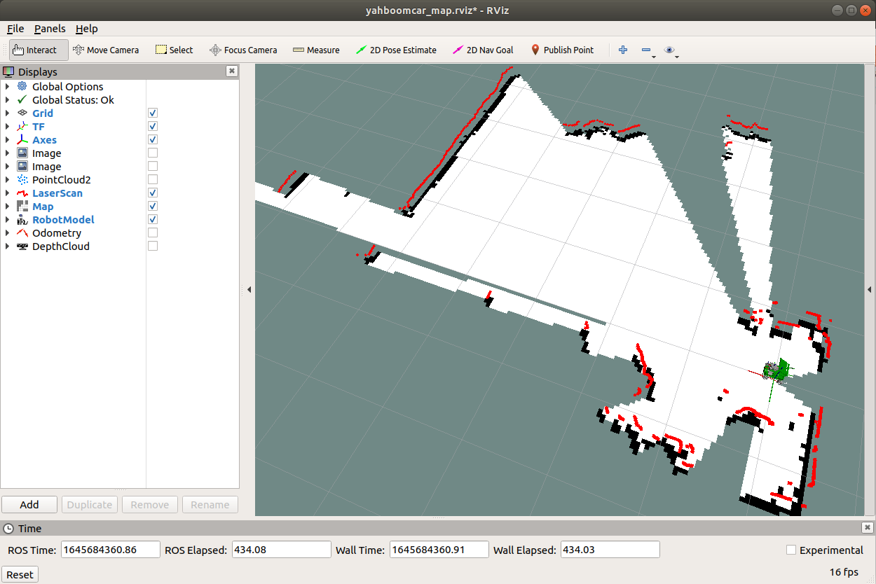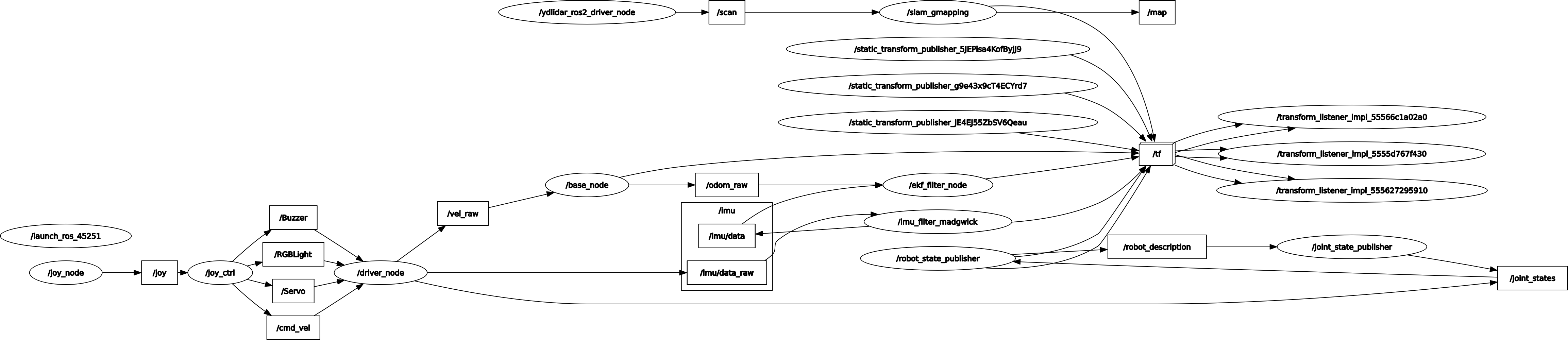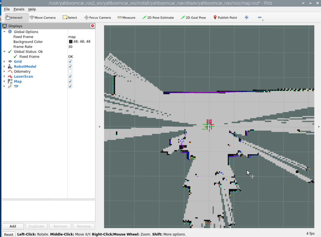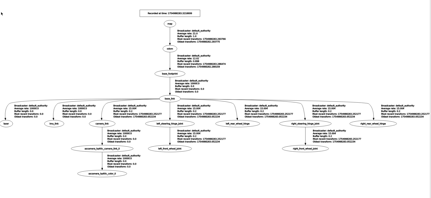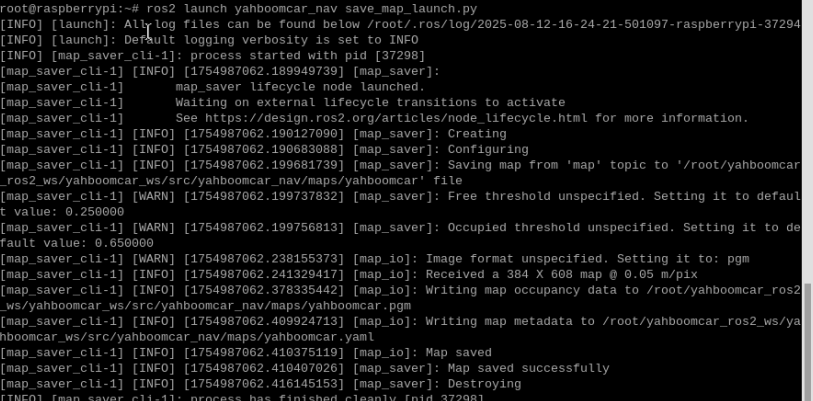 ### 1、算法简介 * gmapping只适用于单帧二维激光点数小于1440的点,如果单帧激光点数大于1440,那么就会出现【[mapping-4] process has died】 这样的问题。 * Gmapping是基于滤波SLAM框架的常用开源SLAM算法。 * Gmapping基于RBpf粒子滤波算法,即时定位和建图过程分离,先进行定位再进行建图。 * Gmapping在RBpf算法上做了两个主要的改进:改进提议分布和选择性重采样。 优点:Gmapping可以实时构建室内地图,在构建小场景地图所需的计算量较小且精度较高。 缺点:随着场景增大所需的粒子增加,因为每个粒子都携带一幅地图,因此在构建大地图时所需内存和计算量都会增加。因此不适合构建大场景地图。并且没有回环检测,因此在回环闭合时可能会造成地图错位,虽然增加粒子数目可以使地图闭合但是以增加计算量和内存为代价。  ### 2、程序功能说明 运行程序后,rviz中会显示建图的界面,用键盘或者手柄去控制小车运动,直到建完图。然后运行保存地图的指令保存地图。 ## 3、机器人键盘控制 ### 3.1、按键说明 #### 3.1.1、方向控制 | 【i】或【I】 | 【 linear,0】 | 【u】 或【U】 | 【linear,angular】 | |---------|---------------|----------|----------------------| | 【,】 | 【-linear,0】 | 【o】 或【O】 | 【linear,- angular】 | | 【j】或【J】 | 【0, angular】 | 【m】或【M】 | 【- linear,- angular】 | | 【l】或【L】 | 【0,- angular】 | 【.】 | 【 - linear,angular】 | #### 3.1.2 速度控制 | 按键 | 速度变化 | 按键 | 速度变化 | |-----|---------------|-----|---------------| | 【q】 | 线速度和角速度都增加10% | 【z】 | 线速度和角速度都减少10% | | 【w】 | 仅线速度增加10% | 【x】 | 仅线速度减少10% | | 【e】 | 仅角速度增加10% | 【c】 | 仅角速度减少10% | | 【t】 | 线速度X轴/Y轴方向切换 | 【s】 | 停止键盘控制 | | 订阅话题 | 类型 | 描述 | |--------------|------------------------|---------------------------| | tf | tf/tfMessage | 用于激光雷达坐标系、基坐标系、里程计坐标系之间转换 | | scan | sensor_msgs/LaserScan | 激光雷达扫描数据 | | 发布话题 | 类型 | 描述 | | map_metadata | nav_msgs/MapMetaData | 发布地图Meta数据 | | map | nav_msgs/OccupancyGrid | 发布地图栅格数据 | | ~entropy | std_msgs/Float64 | 发布机器人姿态分布熵的估计 | | 服务 | 类型 | 描述 | | dynamic_map | nav_msgs/GetMap | 获取地图数据 |  ### 4、程序启动 #### 4.1、启动命令 1、 启动建图 ```启动建图 ros2 launch yahboomcar_nav map_gmapping_launch.py ```  **输入指令启动rviz可视化建图** ```启动rviz可视化建图 ros2 launch yahboomcar_nav display_map_launch.py ```  程序默认已经开启手柄控制功能,如果用手柄现在能直接连接接收器进行控制,如果要使用键盘进行控制,终端输入 ```键盘控制 ros2 run yahboomcar_ctrl yahboom_keyboard ``` 然后控制小车,缓慢的走完需要建图的区域,建图完毕后,输入以下指令保存地图,终端输入 `ros2 launch yahboomcar_nav save_map_launch.py`  会保存一个命名为yahboomcar的地图,这个地图保存在 `~/yahboomcar_ros2_ws/yahboomcar_ws/src/yahboomcar_nav/maps/yahboomcar.yaml` 会有两个文件生成,一个是yahboomcar.pgm,地图如下,(我们的主板可以直接双击查看地图)  yahboomcar.yaml,看下yaml的内容 ## 重要:这个文件的第一个参数一定要与文件名一样 ``` image: yahboomcar.pgm mode: trinary resolution: 0.05 origin: [-10, -21.2, 0] negate: 0 occupied_thresh: 0.65 free_thresh: 0.25 ``` * image:表示地图的图片,也就是yahboomcar.pgm * mode:该属性可以是trinary、scale或者raw之一,取决于所选择的mode,trinary模式是默认模式 * resolution:地图的分辨率, 米/像素 * origin:地图左下角的 2D 位姿(x,y,yaw), 这里的yaw是逆时针方向旋转的(yaw=0 表示没有旋转)。目前系统中的很多部分会忽略yaw值。 * negate:是否颠倒 白/黑 、自由/占用 的意义(阈值的解释不受影响) * occupied_thresh:占用概率大于这个阈值的的像素,会被认为是完全占用。 * free_thresh:占用概率小于这个阈值的的像素,会被认为是完全自由。 ### 5、查看节点通讯图 终端输入 `ros2 run rqt_graph rqt_graph`  如果一开始没有显示,选择【Nodes/Topics(all)】,然后点击左上角的刷新按钮。 #### 6、查看TF树 终端输入 `ros2 run rqt_tf_tree rqt_tf_tree` 程序运行完之后,会出现一个tf转换界面  ### 7、代码解析 这里只说明建图的map_gmapping_launch.py,这个文件路径是 `~/yahboomcar_ros2_ws/yahboomcar_ws/src/yahboomcar_nav/launch/map_gmapping_launch.py` ``` **map_gmapping_launch.py文件代码** from launch import LaunchDescription from launch_ros.actions import Node import os from launch.actions import IncludeLaunchDescription from launch.launch_description_sources import PythonLaunchDescriptionSource from ament_index_python.packages import get_package_share_directory def generate_launch_description(): laser_bringup_launch = IncludeLaunchDescription(PythonLaunchDescriptionSource( [os.path.join(get_package_share_directory('yahboomcar_nav'), 'launch'), '/laser_bringup_launch.py']) ) slam_gmapping_launch = IncludeLaunchDescription(PythonLaunchDescriptionSource( [os.path.join(get_package_share_directory('slam_gmapping'), 'launch'), '/slam_gmapping.launch.py']) ) return LaunchDescription([laser_bringup_launch, slam_gmapping_launch]) ``` 这里启动了一个launch文件-slam_gmapping_launch,详细看下slam_gmapping_launch,该文件位于 ``` ~/yahboomcar_ros2_ws/software/library_ws/src/ros2_gmapping/slam_gmapping/launch/slam_gmapping.launch.py ``` slam_gmapping.launch.py代码: ``` from launch import LaunchDescription from launch.substitutions import EnvironmentVariable import launch.actions import