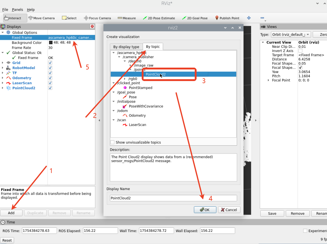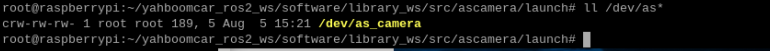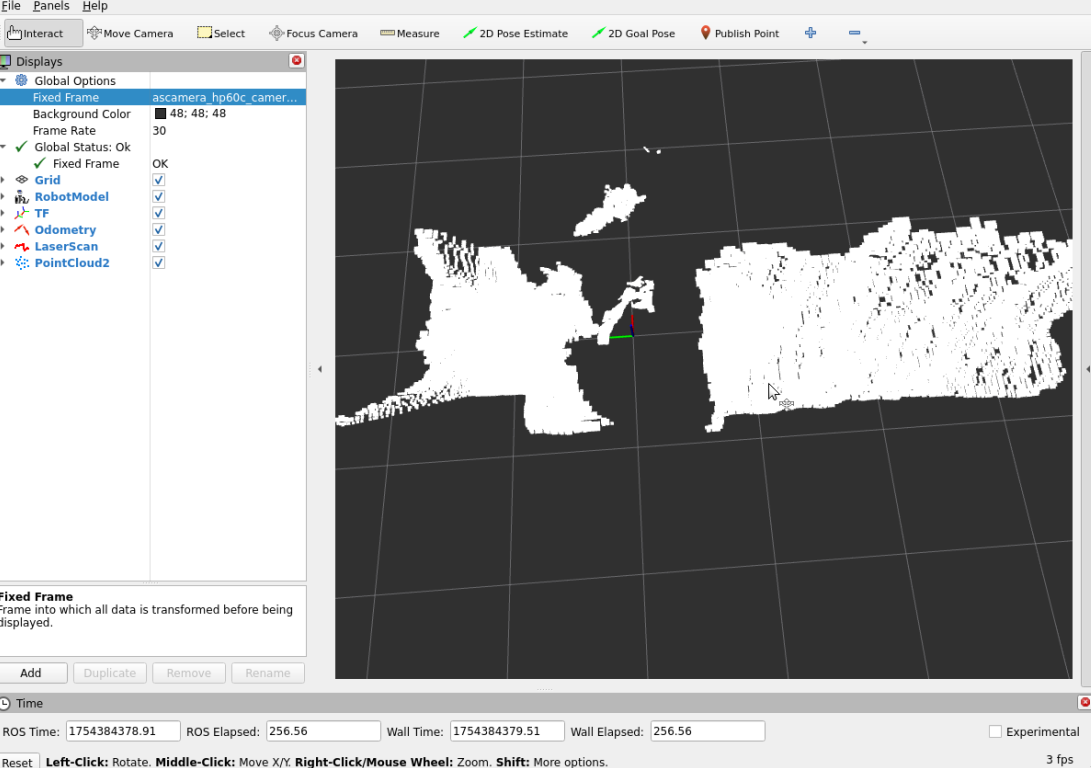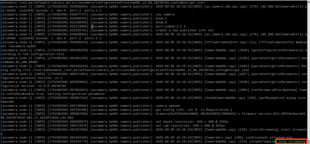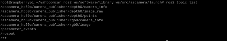 ### 1、程序功能说明 程序运行后,驱动ASJ相机,可以获取到彩色RGB图像信息、深度Depth的深度点云信息 ### 2、程序代码参考路径 ~/yahboomcar_ros2_ws/software/library_ws/src/ascamera/launch/hp60c.launch.py ### 3、程序启动 #### 3.1、启动命令 终端输入以下指令,检查相机设备有没有正常挂载 `ll /dev/as*` 出现以下内容则表示相机成功挂载  终端输入 `ros2 launch ascamera hp60c.launch.py` 出现下面的内容就是启动成功了  可以使用以下命令查看话题,终端中输入 `ros2 topic list`  | 话题名字 | 话题内容 | |---------------------------------------------------|-------------| | /ascamera_hp60c/camera_publisher/rgb0/image | RGB彩色图像数据 | | /ascamera_hp60c/camera_publisher/depth0/image_raw | Depth深度图像数据 | | /ascamera_hp60c/camera_publisher/depth0/points | Depth深度点云数据 | 使用rqt_image_view工具查看图像数据 `ros2 run rqt_image_view rqt_image_view` 然后在左上角选择相对应需要显示的图像话题   使用rviz2显示深度点云 `rviz2`  开启rviz后,按照上图步骤所示,设置可视化点云数据。