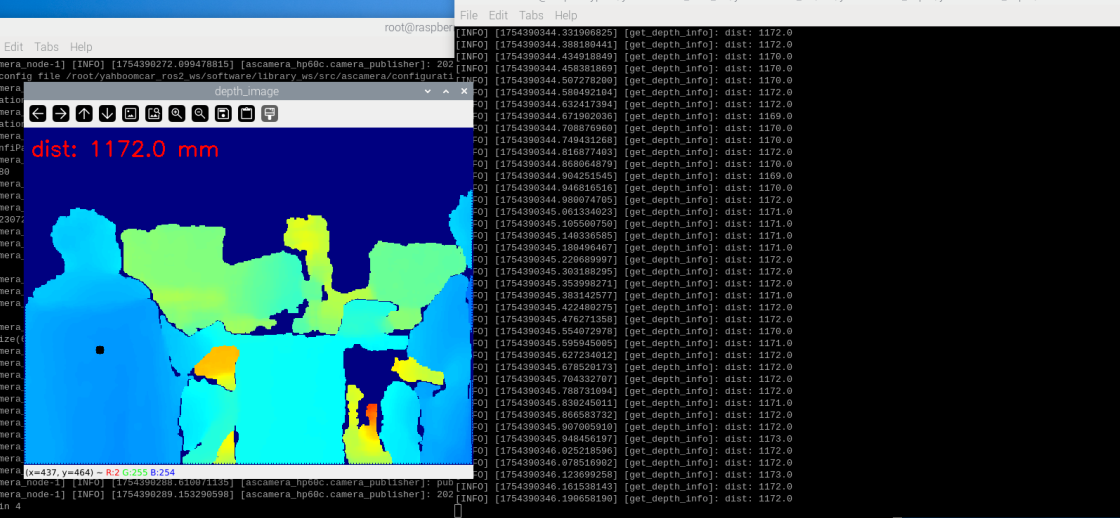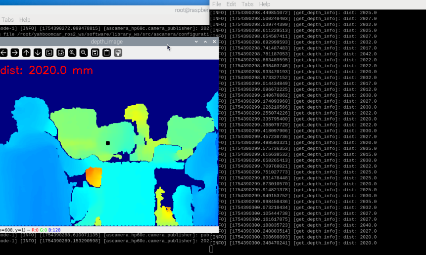 ### 1、程序功能说明 程序启动后,通过鼠标点击伪彩色图像中的点,在深度相机有效的数据范围,画面会显示出该点与深度相机之间的距离。 ### 2、程序代码参考路径 ``` ~/yahboomcar_ros2_ws/yahboomcar_ws/src/yahboomcar_depth/yahboomcar_depth/Basic/get_center_dis.py ``` * get_center_dis.py 主要程序是通过鼠标点击的中心坐标,来获取改坐标的距离,并显示在画面上 ### 3、程序启动 终端输入 ``` ros2 launch ascamera hp60c.launch.py ros2 run yahboomcar_depth get_center_dis ``` 程序启动后,默认获取图像中心点的距离,如果该距离不在深度相机的有效范围内,可能会报错,正常启动如下所示  用鼠标点击伪彩色图像框内的任意点,点击后会出现一个黑色点,表示当前取的点的位置;图像中会显示所取点的距离,并且终端也会同步显示  这里演示,取了旁边椅子的点位,距离是117.2厘米,也就是1172毫米。 ### 4、核心代码 **get_center_dis.py** 这个程序主要有以下几个功能:当用户在深度图像窗口点击鼠标左键时,反馈当前点的距离更新当前检测点的坐标 (x, y)反馈深度距离,窗口显示具体信息部分核心代码如下: ``` def topic_callback(self, msg): # 1. ROS图像转OpenCV格式 1. Convert ROS images to OpenCV format depth_image = self.depth_bridge.imgmsg_to_cv2(msg, encoding[1]) # 2. 图像预处理 2. Image Preprocessing frame = cv.resize(depth_image, (640, 480)) depth_image_info = frame.astype(np.float32) # 3. 获取当前点的深度值 Get the depth value of the current point dist = depth_image_info[self.y, self.x] # 4. 创建彩色深度图像 Creating a color depth image depth_image_colored = cv.applyColorMap( cv.convertScaleAbs(depth_image, alpha=0.06), cv.COLORMAP_JET ) # 5. 深度值处理和记录 Depth value processing and recording self.get_logger().info(f'dist: {dist}') dist = round(dist, 3) dist_text = f'dist: {dist} mm' # 6. 在图像上添加文本 6. Add text to the image cv.putText(depth_image_colored, dist_text, (10, 40), cv.FONT_HERSHEY_SIMPLEX, 1.0, (0, 0, 255), 2) # 7. 标记当前检测点 7. Mark the current detection point cv.circle(depth_image_colored, (self.x, self.y), 1, (0, 0, 0), 10) # 8. 显示图像并设置鼠标回调 8. Display the image and set the mouse callback cv.imshow(self.window_name, depth_image_colored) cv.setMouseCallback(self.window_name, self.click_callback) # 关联鼠标事件 # Associate mouse events cv.waitKey(1) ```