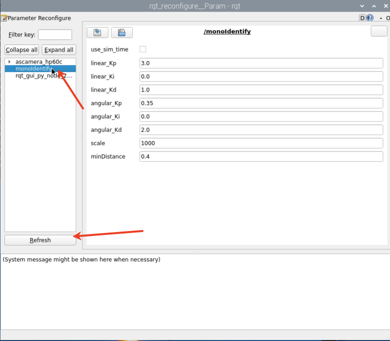 ### KCF物体跟随 #### 1、程序功能说明 程序启动后,可以通过鼠标在画面中框选需要跟随的物体,按下 空格键 ,小车进入跟踪模式。小车会与被跟踪的物体保持0.4米的距离,并且时刻保证被追踪的物体保持在画面中心。按下R键则进入选择模式,按下Q键则退出程序。。 **⚠️该功能对框选区域大的物体,跟随效果会比较好,缓慢移动否则容易丢失目标。** ### 2、程序代码参考路径 ``` /root/yahboomcar_ros2_ws/yahboomcar_ws/src/yahboomcar_depth/yahboomcar_depth/kcf/KCF_Tracker.py /root/yahboomcar_ros2_ws/yahboomcar_ws/src/yahboomcar_depth/yahboomcar_depth/astra_common.py ``` mono_Tracker.py 主要是完成物体检测与追踪,根据检测到的物体中心坐标,计算出小车前进的转弯角度和前进距离速度,发布控制舵机角度、电机控制速度数据到小车。 astra_common.py 函数(Tracker)类:实现多种OpenCV追踪算法(BOOSTING、KCF、CSRT等) 提供追踪器初始化(initWorking)和实时更新(track)接口 ### 3、程序启动 #### 3.1、启动命令 终端输入: ``` #启动深度相机数据 ros2 launch ascamera hp60c.launch.py #启动小车底盘、雷达 ros2 launch yahboomcar_bringup laser_bringup_launch.py #启动颜色跟随程序 ros2 run yahboomcar_depth KCF_Tracker ``` 程序启动后,会出现以下画面:  使用鼠标在画面中框选需要追踪的物体,(如果容易跟丢的话建议框选大一点明显一点的物体)  然后,按下空格键进入跟随模式,缓慢移动物体,小车会跟着移动并且与物体保持1m的距离。  ### 3.2、动态参数调节 终端输入,`ros2 run rqt_reconfigure rqt_reconfigure`  ☑️ 修改完参数,点击GUI空白处写入参数值。注意只会生效当次启动,永久生效需要将参数修改到源码当中。 参数解析: 【linear_Kp】、【linear_Ki】、【linear_Kd】:小车跟随过程中的线速度PID调控。 【angular_Kp】、【angular_Ki】、【angular_Kd】:小车跟随过程中的角速度PID调控。 【minDistance】:跟随距离,一直保持这个距离。 【scale】:PID比例缩放。 ## 4、核心代码 #### 4.1、KCF_Tracker.py 这个程序主要有以下几个功能: * 初始化KCF追踪器 * 订阅深度话题,获取图像 * 通过鼠标交互选择追踪目标 * 计算目标中心坐标并发布 * 使用PID算法计算舵机角度、前进速度并发布控制指令 部分核心代码如下 ``` #追踪初始化 self.tracker_type = 'KCF' #距离计算 #Distance calculation points = [ (int(self.cy), int(self.cx)), # 中心点 (int(self.cy +1), int(self.cx +1)), # 右下偏移点 (int(self.cy - 1), int(self.cx - 1)) # 左上偏移点 ] valid_depths = [] for y, x in points: depth_val = depth_image_info[y][x] if depth_val != 0: valid_depths.append(depth_val) if valid_depths: dist = int(sum(valid_depths) / len(valid_depths)) else: dist = 0 #控制执行 #Control execution if dist > 0.2: # 有效距离阈值(0.2米) Effective distance threshold (0.2 meters) self.execute(self.Center_x, dist) # 执行控制 Execution control # 根据x值、y值,使用PID算法,计算运动速度,转弯角度 # Calculate the movement speed and turning angle using the PID algorithm based on the x and y values def execute(self, rgb_img, action): #PID计算偏差 PID calculation deviation linear_x = self.linear_pid.compute(dist, self.minDist) angular_z = self.angular_pid.compute(point_x,320) # 小车停车区间,速度为0 The car is in the parking area and the speed is 0 if abs(dist - self.minDist) < 30: linear_x = 0 if abs(point_x - 320.0) < 30: angular_z = 0 twist = Twist() ... # 将计算后的速度信息发布 Publish the calculated speed information self.pub_cmdVel.publish(twist) ```