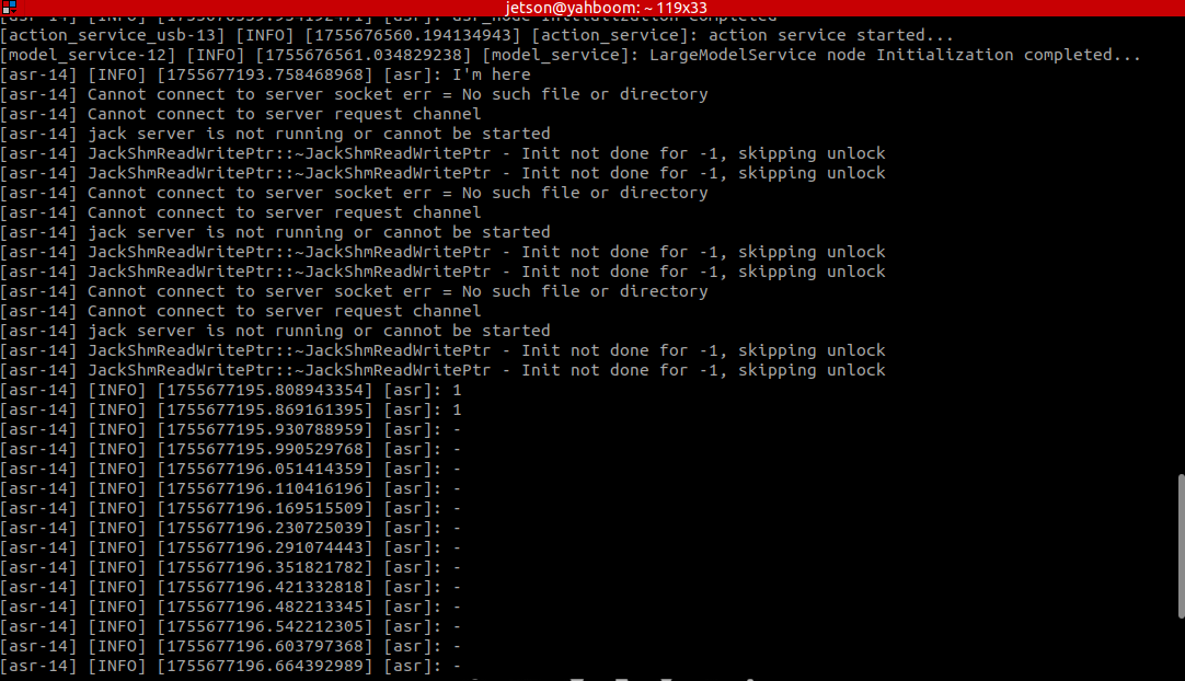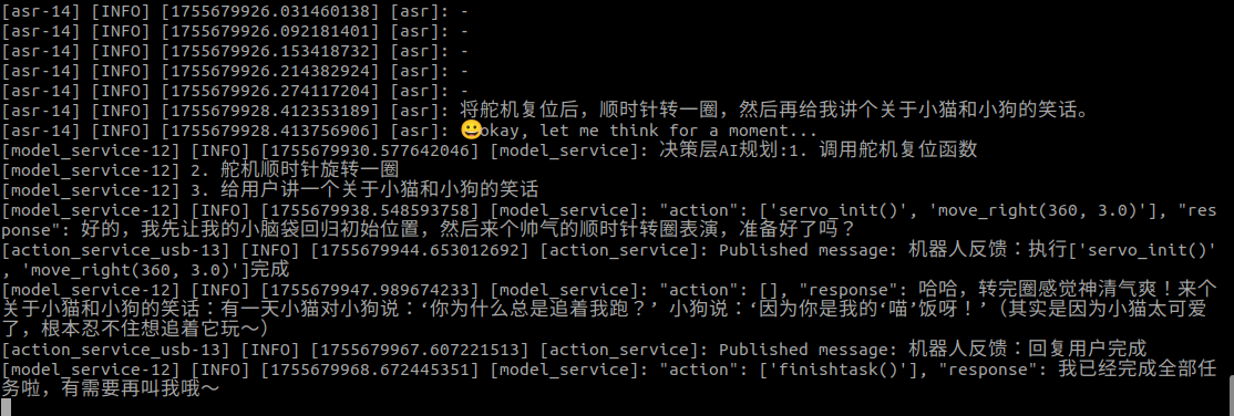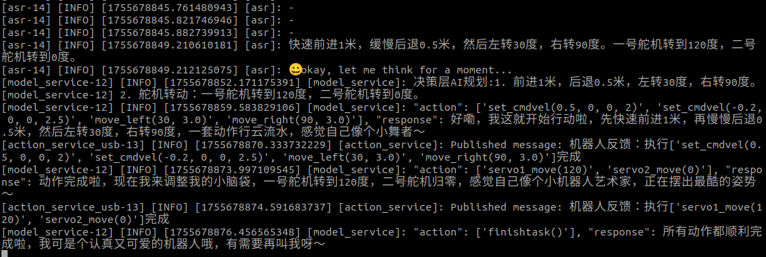 ### **多模态是指利用多种不同形式或感知渠道的信息进行表达、交流和理解的方式,通常包括视觉、听觉、文本、触觉等多种感官输入和输出方式。在计算机科学、人工智能和机器学习领域,多模态技术指的是通过整合来自不同模态的数据(如图像、文字、音频、视频等),从而增强模型的理解能力和推理能力。这种整合可以提高信息的完整性和准确性,因为每种模态可以为特定任务提供独特的信息。例如,在自动驾驶中,摄像头提供视觉信息,激光雷达提供空间感知数据,结合这些多模态信息可以使系统更好地识别障碍物并做出准确的决策。在自然语言处理和计算机视觉领域,多模态模型能够同时处理图像和文本任务,如图文描述生成、视觉问答等,帮助模型实现跨领域的理解和生成。这种多模态技术被广泛应用于人机交互、自动驾驶、医疗诊断等场景,展示了其强大的应用潜力。** ### 1、语义理解和指令遵循 #### 1.课程内容 运行大模型程序后,用户可以通过语音对话方式与机器人进行交互,用户语音指令首先通过语音识别大模型转换成文字,再由文本生成大模型和视觉多模态精准理解用户指令和语音,最后机器人按照用户指令完成指定动作并回复用户。 ### 2.准备工作 连接机器人,打开终端 ### 3. 运行案例 #### 3.1 启动程序 打开终端输入命令: ``` ros2 launch largemodel largemodel_control.launch.py ```  初始化完成后会显示如下内容  ### 3.2 测试案例 这里给出的测试案例,可以自行编撰自己的测试指令 比如: **快速前进1米,缓慢后退0.5米,然后左转30度,右转90度,1号舵机转到120度,2号舵机转到0度。 将舵机复位后,顺时针转一圈,然后再给我讲个关于小猫和小狗的笑话** #### 3.2.1 案例1 首先使用"你好小亚"唤醒机器人,机器人回应:"**我在,请吩咐**",机器人应答后蜂鸣器短暂(beep—)响后,用户可以进行讲话,机器人会进行动态声音检测,如果有声音活动则打印1,无声音活动会打印-,当说话结束后会进行尾音检测,静音超过450ms则停止录音。 动态声音检测(VAD)如下图所示:  机器人会先与用户进行对方回复用户,然后按照指令动作,同时终端打印信息如下:  **大模型回复信息解读:** **决策层大模型输出**:决策层AI规划:1. 前进1米, 后退0.5米, 左转30度, 右转90度 2.一号舵机转到120度, 二号舵机转到0度。 **决策层大模型输出**:[model_service]: "action": ['set_cmdvel(0.5, 0, 0, 2)', 'set_cmdvel(-0.2, 0, 0, 2.5)', 'move_left(30, 3.0)', 'move_right(90, 3.0)'], "response": 好嘞,我这就开始行动啦,先快速前进1米,再慢慢后退0.5米,然后左转30度,右转90度,一套动作行云流水,感觉自己像个小舞者~、[action_service]: Published message: 机器人反馈:执行['set_cmdvel(0.5, 0, 0, 2)', 'set_cmdvel(-0.2, 0, 0, 2.5)', 'move_left(30, 3.0)', 'move_right(90, 3.0)']完成,[model_service]: "action": ['servo1_move(120)', 'servo2_move(0)'], "response":动作完成啦,现在我来调整我的小脑袋,一号舵机转到120度,二号舵机归零,感觉自己像个小机器人艺术家,正在摆出最酷的姿势~,[action_service]: Published message: 机器人反馈:执行['servo1_move(120)', 'servo2_move(0)']完成、[model_service]: action": ['finishtask()'], "response": 所有动作都顺利完成啦,我可是个认真又可爱的机器人哦,有需要再叫我呀~ 动作列表中有**finishtask()**,证明执行层大模型判定机器人已经完成了用户指令,进入**等待状态**,此时可以再此唤醒小亚,结束当前任务:  **3.2.2 案例2** 和案例1测试相同,首先使用"你好小亚"唤醒机器人,机器人应答后蜂鸣器短暂(beep—)响后,用户可以进行讲话,讲话完成后,机器人回复用户并按照指令进行运动。  ### 4.常见问题解决方案 #### 4.1麦克风录音过于灵敏 如果发现在说话阶段结束后VAD语音活动检测一直显示“1”,无法停止录音证明是麦克风设置过于灵敏一直有语音活动,可以尝试降低麦克风灵敏度 首先通过VNC连接机器人车机端画面,jetson用户,点击右上方选项栏,找到**Settings**选项。  下拉左侧Settings列表,找大Sound选项,在Sound页面找到Input音频输入Input Device,拖动下方Volume即可调整灵敏度,录音时尝试调整至合适值。  ### 5.2麦克风录音不灵敏 如果说话人的位置与机器人之间距离较远,则VAD语音活动检测可能会检测不到声音活动,导致说话人话没说完就提前结束录音,此时可以参考5.1麦克风录音过于灵敏中的步骤适当增大麦克风灵敏度。 >i **信息提示** > > 注意: > 如果麦克风灵敏度调整的过高,则可能提高对环境噪音的误判,将环境噪音认为是语音活动。 ### 5.3语音识别不完整 不同语音识别模型对相同音频的识别效果会有差异,推荐使用默认设置的paraformer系列模型或本地SenseVoiceSmall 模型。我们机器人默认就是这个。 #### 5.4语音模块识别错误 语音模块接触不稳定,建议更换USB口,或者拔插解决