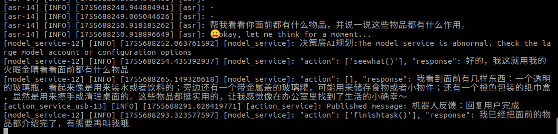 ### 多模态视觉理解 #### 1.课程内容 1.学习使用机器人的视觉理解功能 2.学习新出现的关键源码 #### 2.准备工作 #### 2.1 内容说明 直接打开终端,输入本节课程提及的指令即可。 📝 示例使用multimodel : "qwen-vl-max-2025-04-08" 国际版用户使用model:"qwen/qwen2.5-vl-72b-instruct:free","qwen-vl-latest" ⚠️ 同样的测试指令,大模型回复的内容不会完全相同,和教程中截图会略有差异,如果需要增强或减弱大模型回复的多样性,参考【AI大模型基础知识】-【5.配置AI大模型】课程中配置决策层大模型参数部分。 ### 3. 运行案例 #### 3.1 启动程序 打开终端输入命令: ``` ros2 launch largemodel largemodel_control.launch.py ```  初始化完成后会显示如下内容,  ### 3.2 测试案例 这里给出两条参考的测试案例,你们可自行编撰自己的测试指令 **帮我看看你面前都有什么物品,并说一说这些物品都有什么作用 请你看看面前有没有蓝色方块和一包纸巾,有的话你就点点头,没有的话你就摇摇头** **3.2.1 案例1** 首先使用"你好小亚"唤醒机器人,机器人回应:"我在,请吩咐",机器人应答后蜂鸣器短暂(beep—)响后,用户可以进行讲话,机器人会进行动态声音检测,如果有声音活动则打印1,无声音活动会打印-,当说话结束后会进行尾音检测,静音超过450ms则停止录音。 动态声音检测(VAD)如下图所示:  机器人会先与用户进行对方回复用户,然后按照指令动作,同时终端打印信息如下:   动作列表中有**finishtask()**,证明执行层大模型判定机器人已经完成了用户指令,进入**等待状态**,此时可以再此唤醒小亚,结束当前任务:  ### 4.源码解析 源码位于: jetson orin nano 主机: ``` #NUWA相机用户 /home/jetson/yahboomcar_ros2_ws/yahboomcar_ws/src/largemodel/largemodel/action_service_nuwa.py ``` **action_service.py程序** 在CustomActionServer类的**init_ros_comunication**方法中,创建了seewhat_handle的话题发布者,用于发布视觉处理信号 ``` #创建发布者,发布 seewhat_handle 话题 self.seewhat_handle_pub = self.create_publisher(String, 'seewhat_handle', 1) ``` nuwa深度相机,action_service_nuwa.py 创建了/ascamera_hp60c/camera_publisher/rgb0/image的话题订阅者,用于接收深度相机的彩色画面 ``` #图像话题订阅者 self.subscription = self.create_subscription( Image, self.image_topic, self.image_callback, 1 ) ``` image_callback回调函数会不断订阅深度相机的彩色画面, 当动作服务器调用**seewhat**方法时,会向seewhat_handle话题发布信号,通知模型服务器model_service节点向多模态大模型上传一张图像 ``` def seewhat(self): self.save_single_image() msg = String(data="seewhat") self.seewhat_handle_pub.publish( msg ) # 归一化,发布seewhat话题,由model_service调用大模型 ``` 此时会调用save_single_image方法保存一张image.png图像文件, 图像保存路径: /home/jetson/yahboomcar_ros2_ws/yahboomcar_ws/install/largemodel/share/largemodel/resources_file/image.png **model_service.py程序** 在LargeModelService类的**init_ros_comunication**方法中 创建了seewhat_handle的话题订阅者,用于接收视觉处理信号 **#创建seehat订阅者 self.seewhat_sub = self.create_subscription(String,'seewhat_handle', self.seewhat_callback,1)** seewhat_callback回调函数接收到视觉处理信号时,会调用**dual_large_model_mode**方法,再调用**instruction_process**方法请求推理,将一张深度相机的图像上传至多模态大模型。 ``` def seewhat_callback(self, msg): if msg.data == "seewhat": if ( self.regional_setting == "China" ): # 在线模型推理方式:决策层推理+执行层监督 / Online model inference method: Decision layer reasoning + Execution layer supervision self.dual_large_model_mode(type="image") else: self.dual_large_model_international_model(type="image") def instruction_process(self, prompt, type, conversation_id=None): """ 根据输入信息的类型(文字/图片),构建不同的请求体进行推理,并返回结果) Based on the type of input information (text/image), construct different request bodies for inference and return the result. """ json_str = None prompt_seewhat = self.prompt_dict[self.language].get("prompt_2") if self.regional_setting == "China": # 国内版 if type == "text": raw_content = self.model_client.multimodalinfer(prompt) elif type == "image": raw_content = self.model_client.multimodalinfer( prompt_seewhat, image_path=self.image_save_path ) json_str = self.extract_json_content(raw_content) elif self.regional_setting == "international": # 国际版 if type == "text": result = self.model_client.TaskExecution( input=prompt, map_mapping=self.map_mapping, language=self.language_dict[self.language], conversation_id=conversation_id, ) if result[0]: json_str = self.extract_json_content(result[1]) self.conversation_id = result[2] else: self.get_logger().info(f"ERROR:{result[1]}") elif type == "image": result = self.model_client.TaskExecution( input=prompt_seewhat, map_mapping=self.map_mapping, language=self.language_dict[self.language], image_path=self.image_save_path, conversation_id=conversation_id, ) if result[0]: json_str = self.extract_json_content(result[1]) self.conversation_id = result[2] else: self.get_logger().info(f"ERROR:{result[1]}") ```