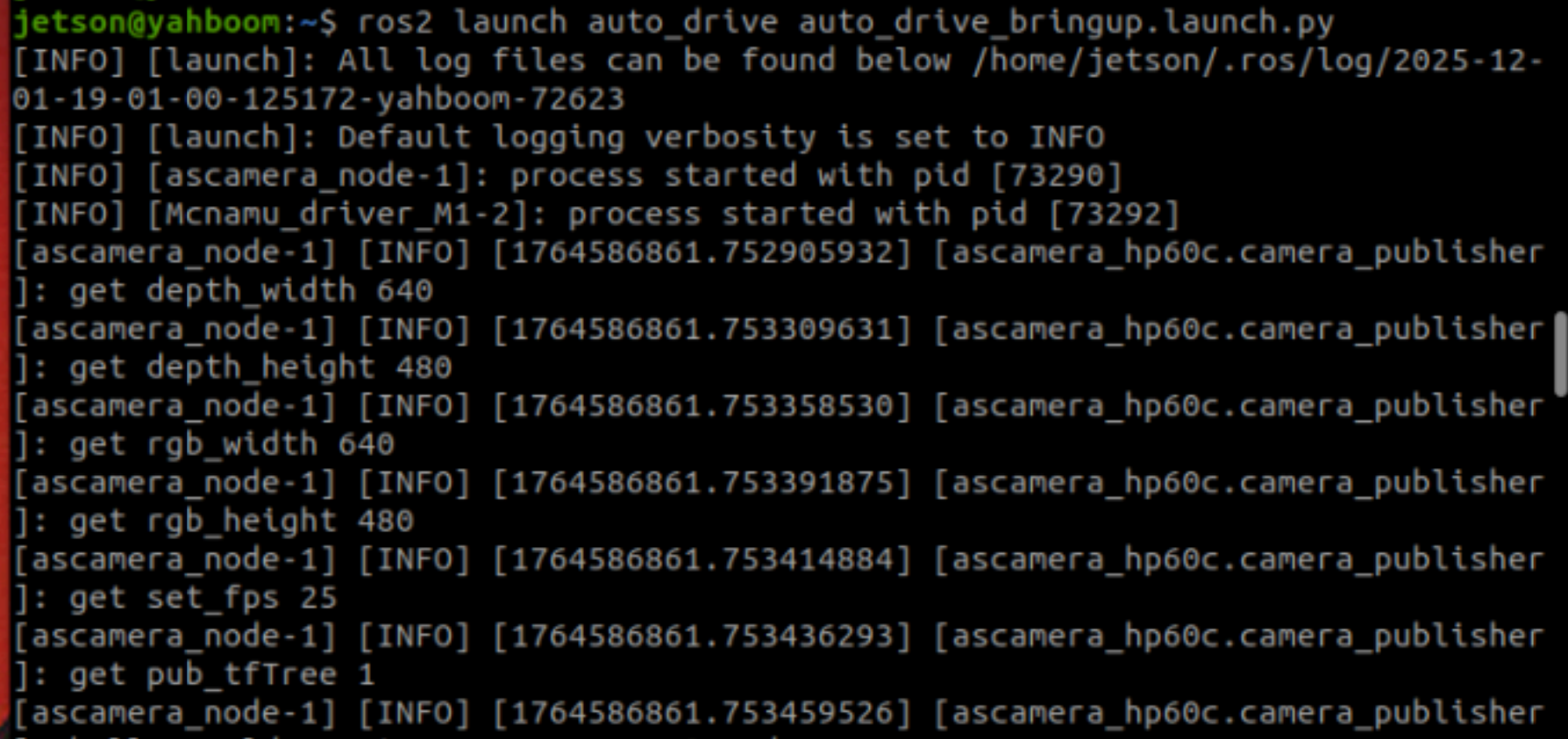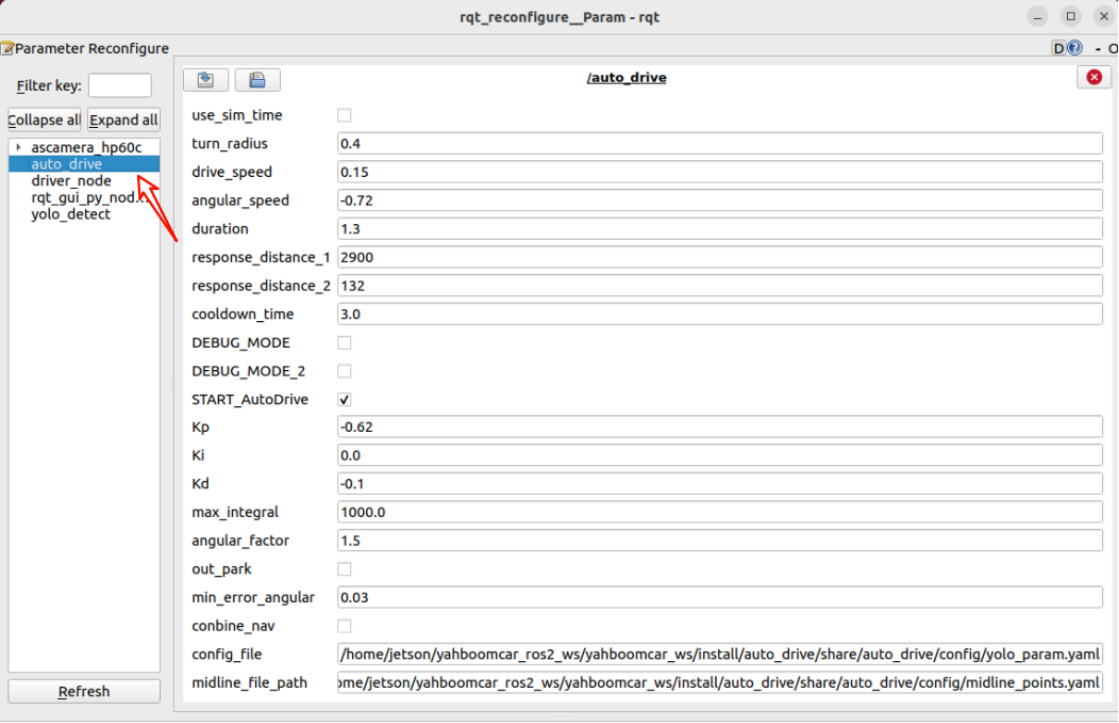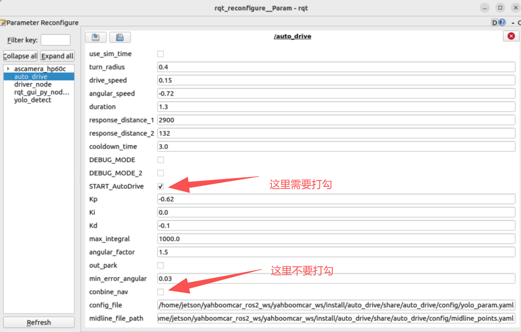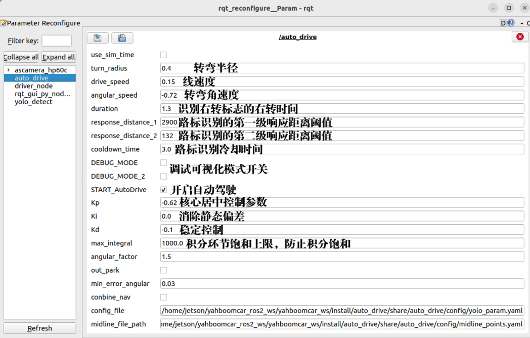 ## 自动驾驶综合应用 ### 1.课程内容 注意:这个程序是在沙盘地图上运行的,如果在其他地图需要自行调整程序 该教程使用的是出厂的路标模型和车道线识别模型,在沙盘地图上进行居中运动,同时识别到路标会做对应的路标函数动作。 命令组合:(使用不同的终端打开) ```第一步打开语音环境,输入cd / 进入根目录 ros2 launch largemodel largemodel_control.launch.py ``` ```第二步打开自动驾驶,输入cd / 进入根目录 ros2 launch auto_drive auto_drive_bringup.launch.py ``` ```第三步打开终端返回根目录 ros2 run rqt_reconfigure rqt_reconfigure ``` **第四步:START_AutoDrive 打勾就会自动驾驶** * 小车左右震荡:减小`Kp`,适度增大`Kd`; * 小车回正缓慢:适度增大`Kp`,减小`Kd`; * 右转过冲 / 不足:调整`duration`或`angular_speed`; * 路标识别误触发:增大`cooldown_time`,调整`response_distance_1/2`。 #### 安全调节提示: * 先调`drive_speed`(基础速度)→ 再调`angular_speed/duration`(转弯匹配)→ 最后调 PID(Kp/Kd/Ki); * 禁止一次性修改多个核心参数(如同时改`drive_speed`+`Kp`),难以定位问题。 * **安全调试流程**: * 先设`START_AutoDrive: False`,验证路标识别 / 偏差计算是否正常; * 再设`drive_speed`为低速(如 0.1m/s),开启`DEBUG_MODE: True`,观察居中效果; * 最后逐步提速,微调 PID 参数。  ### 2.程序路径 自动驾驶源码路径: #### 2.1车道线保持: ``` /home/jetson/yahboomcar/ros2/ws/yahboomcar/ws/src/auto/drive/auto/drive/auto/drive.py ``` #### 路标识别: ``` /home/jetson/yahboomcar/ros2/ws/yahboomcar/ws/src/auto/drive/auto/drive/yolo/detect.py ``` ### 3.运行案例程序 #### 3.1 运行程序 启动相机+底盘+路标车道线程序运行之后会显示yolo识别画面,小车会车道线居中运行,同时会根据行驶过程中识别到的路标做对应的动作。(如果开启程序之后终端没有报错,小车不动,可以运行下面程序来检查参数) ```这是启动自动驾驶的命令 ros2 launch auto_drive auto_drive_bringup.launch.py ```  程序运行之后会显示yolo识别画面,小车会车道线居中运行,同时会根据行驶过程中识别到的路标做对应的动作。(如果开启程序之后终端没有报错,小车不动,可以运行下面程序来检查参数)  * 启动动态参数配置节点 ## ** 这个命令必须先用cd / 回车才可以使用,就是返回到home的根目录** ```必须启动了自动驾驶才可以运行这个命令,否则打开后窗口为空 ros2 run rqt_reconfigure rqt_reconfigure ```  ### 如果小车不动检查两个参数,START_AutoDrive 是否勾上了,conbine_nav是否为flase ☑️ 修改完参数,点击GUI空白处写入参数值。注意只会生效当次启动,永久生效需要将参数修改到源码当中。 🛠 参数解析: 【turn_radius】:转弯半径。正常不需要更改这个参数 【drive_speed】:线速度大小。小车的行驶速度,默认是0.15,如果修改这个参数需要自行同步调试其他的参数 【angular_speed】:转弯角速度大小 【duration】:识别右转标志的右转时间, 【cooldown_time】:路标识别冷却时间 【DEBUG_MODE】:可视化debug参数,打开可能会影响居中效果 【START_AutoDrive】:控制小车运动参数,true为小车可运动 【kp、ki、kd】:小车居中pid参数 【turn_radius】:转弯半径。正常不需要更改这个参数 【conbine_nav】:**路网导航+开启yolo才需要打开,打开之后小车会停止不动** ### 3.2 识别到路标之后小车的运动 【straight】:小车根据默认线速度直行。 【turnright】:小车会停下来一秒,根据固定动作进行转弯。注意摆放右转标志的路标这里是固定放在停车场附近的蓝框内 【honking】 : 鸣笛一秒 【speedlimit】:减速三秒之后恢复正常行驶 【stop】:停车三秒之后恢复正常行驶 【school】:减速三秒之后鸣笛一秒 【parkA、parkB】:停车固定动作,之后小车停止,需要【straight】【speedlimit】解锁才会正常行驶 【redlight】:停车不动 【greenlight】:小车继续行驶 【yellowlight】:停车三秒之后恢复正常行驶 下图是右转和停车位置固定位置,因为程序采用了固定动作所以要效果好建议是放到这个位置,如果需要放到其他的位置需要重新去调试固定动作时间 。  ### 3.3 调试参数 这里分为两种调试参数的方案,一种是临时实时调试,一种是永久修改参数调试临时实时调试运行程序之后运行动态调参指令去调试: ```必须启动了自动驾驶才可以运行这个命令,否则打开后窗口为空 ros2 run rqt_reconfigure rqt_reconfigure ```  调试经验: 1. 如果车道居中保持不稳定可以去看《车道保持》章节 2. 识别右转,转弯不够或者转弯过头可以调节duration这个参数来控制右转弯时间 3. 防止频繁识别路标,修改cooldown_time路标冷却,表示识别路标之间的冷却时长 4. 车道居中调整过慢,调大kp。 永久修改参数调试通过修改参数文件来达到永久修改参数,参数路径 /home/jetson/yahboomcar_ros2_ws/yahboomcar_ws/src/auto_drive/config/auto_drive_node.yaml /home/jetson/yahboomcar_ros2_ws/yahboomcar_ws/src/auto_drive/config/yolo_param.yaml /home/jetson/yahboomcar_ros2_ws/yahboomcar_ws/src/auto_drive/config/midline_points.yaml 三个参数分别表示:自动驾驶参数、路标识别参数、车道线居中参数 ### 自动驾驶参数: ``` auto_drive: ros_parameters: turn_radius: 0.4 //转弯半径。正常不需要更改这个参数 drive_speed: 0.15 //线速度大小。小车的行驶速度,默认是0.15,如果修改这个参数需要自行同步调试其他的参数 angular_speed: -0.72 //转弯角速度大小 duration: 1.3 //识别右转标志的右转时间 response_distance_1: 2900 response_distance_2: 132 cooldown_time: 3.0 //路标识别冷却时间 DEBUG_MODE: False //