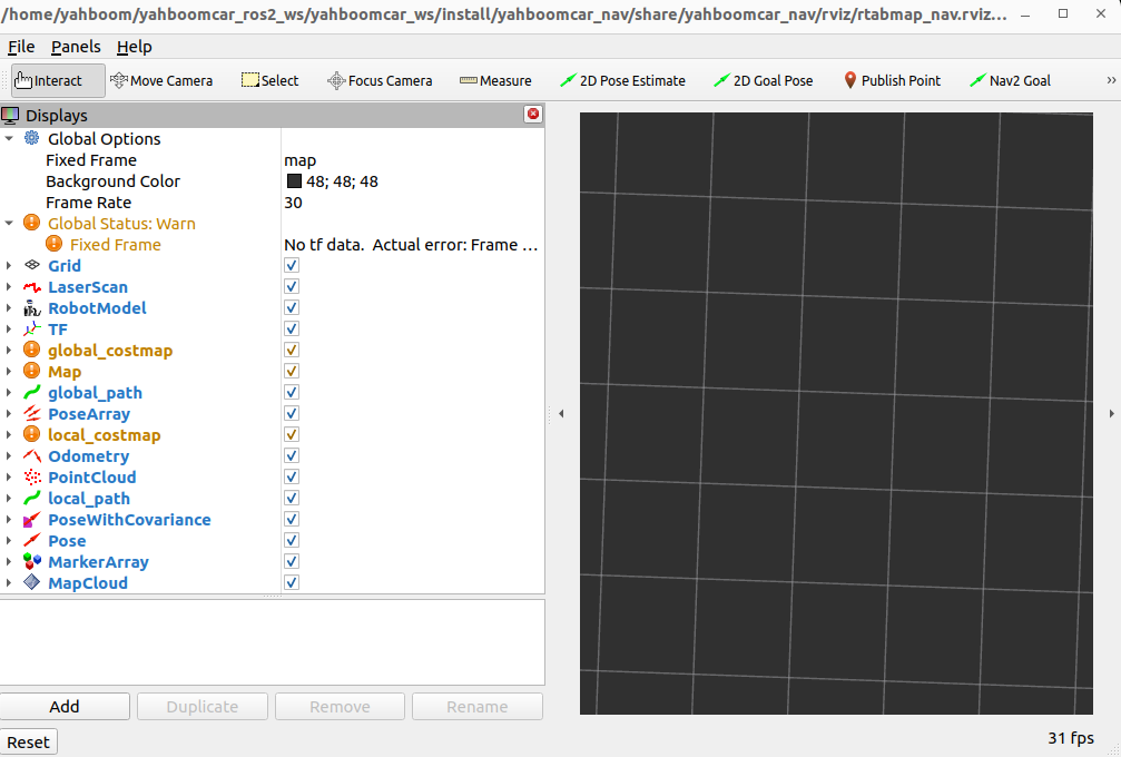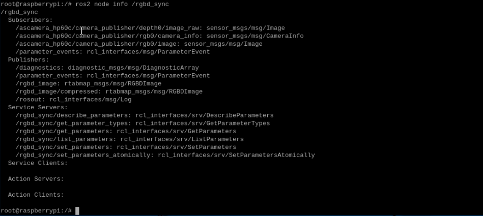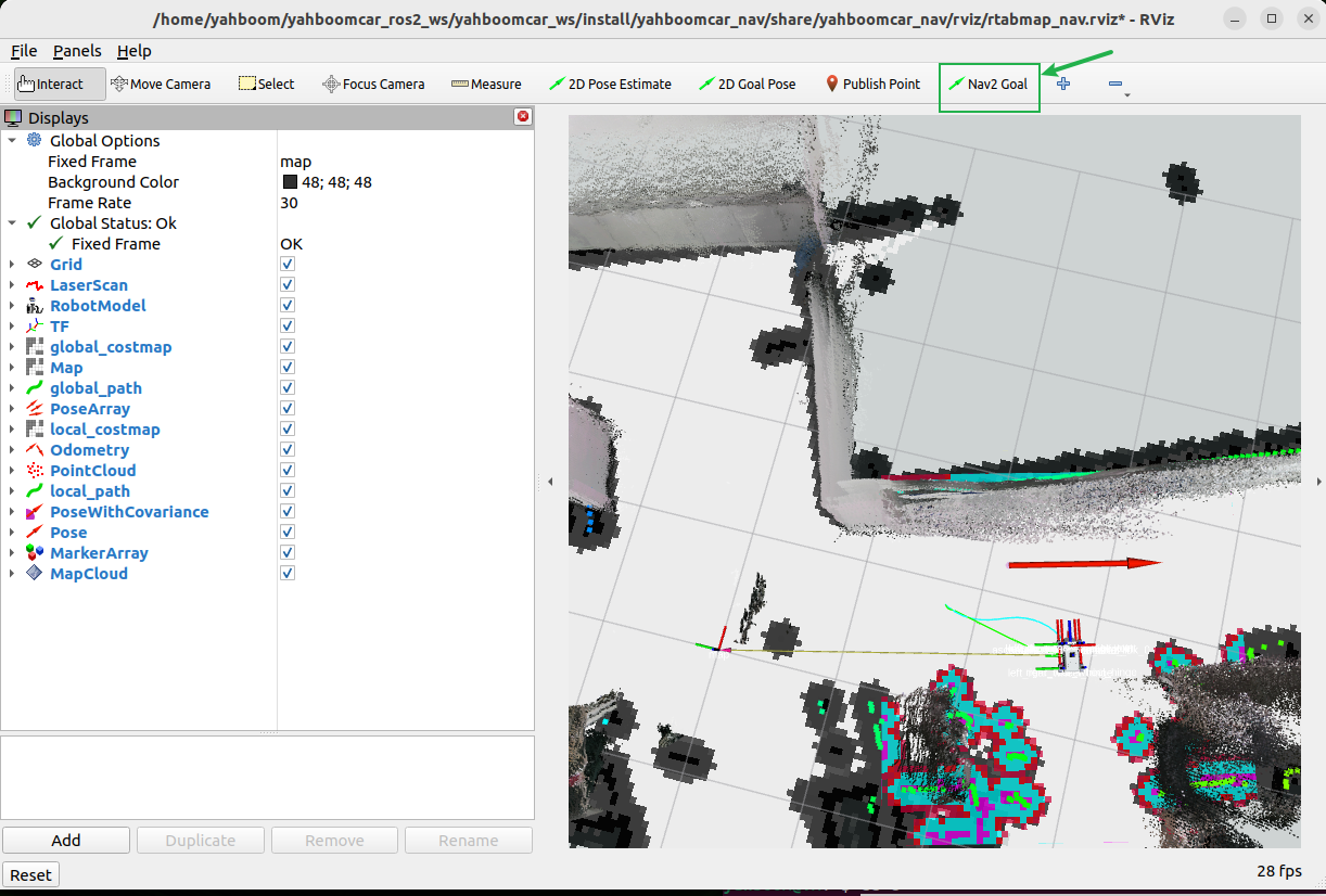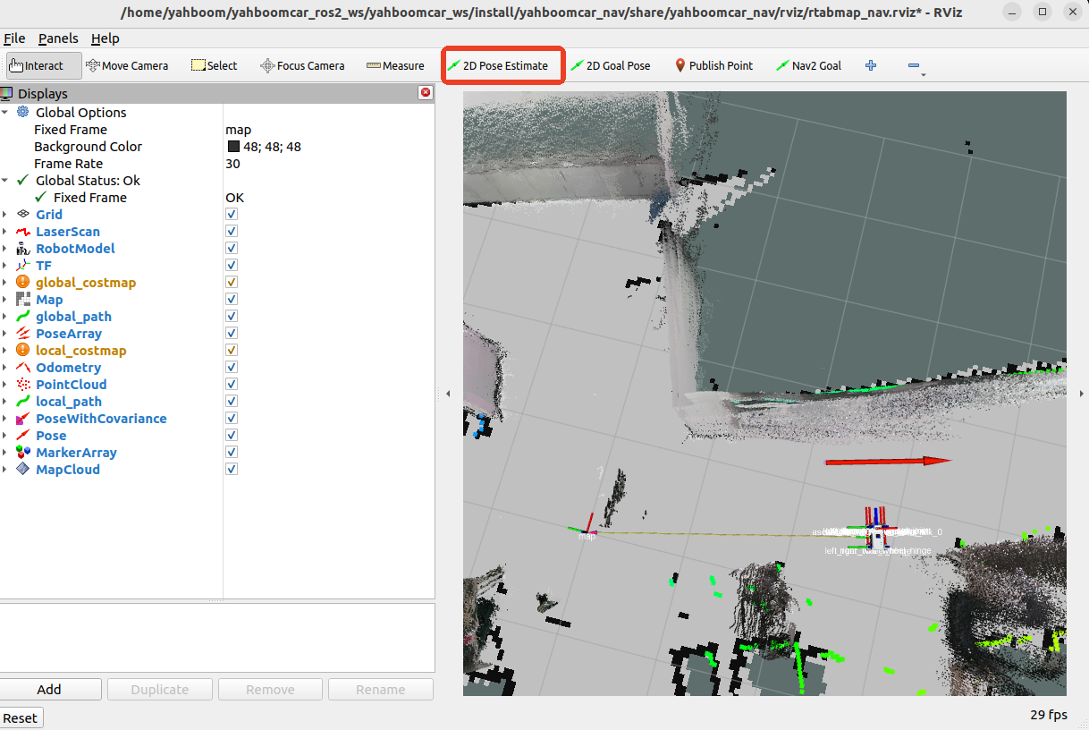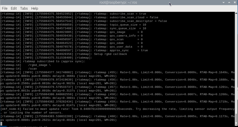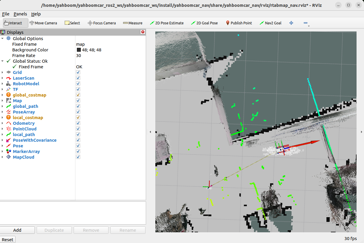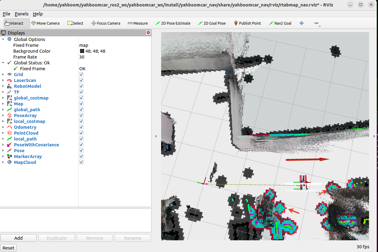 ## RTAB-Map导航 ### 1、内容说明 本节内容说明了如何结合小车底盘、激光雷达和深度相机以及Navigation2,实现RTAB-Map导航。 本节内容需要在终端中输入指令,主板直接打开终端,输入本节课程提及的指令即可。 ### 2、准备工作 * 处在同一个局域网内,这个最简单的就是连接同一个wifi即可实现;我们的主板可以直接在主板上运行。 * ### 3、程序启动 首先,小车终端输入以下指令,启动深度相机, `ros2 launch ascamera hp60c.launch.py`  虚拟机端输入以下指令,进行rviz可视化, `ros2 launch yahboomcar_nav display_rtabmap_nav_launch.py`  等待启动RTAB导航,终端输入以下指令,进行底盘+相机 `ros2 launch yahboomcar_nav navigation_rtabmap_launch.py `  同时rviz会显示出地图  * 从rviz中可以看到机器人能自动完成初始位置估计,无需手动初始化位置 * 如果小车初始位置偏差较大可以使用rviz工具栏中【2D Pose Estimate】工具给出大致的位置,即可完成快速定位 *  终端输入以下指令,启动navigation2导航, ` ros2 launch yahboomcar\_nav rtabmap\_nav\_launch.py 全部成功启动后会出现膨胀区域,如下图,  然后使用rivz中的【Nav2 Goal 】工具就可以给定小车一个目标点,小车会导航到该点。   **注意:如果导航效果不佳可以到封闭的环境进行建图导航,因为这款小车依赖深度视觉里程计,小车走直线不是很直当小车前进和拐弯都会导致深度视觉里程计会有偏差,最后累积误差多了导致出现漂移,如果在封闭的环境效果会好点,或者增加建图时间把地图的每一个特征点都记录多点。** ### 4、查看节点通讯图 终端输入, ` ros2 run rqt_graph rqt_graph `  ### 5、rtabmap导航相关节点详情 查看rgb图像同步节点信息 `ros2 node info /rgbd_sync`  查看/rtabmap节点 `ros2 node info /rtabmap` ``` /rtabmap Subscribers: /global_pose: geometry_msgs/msg/PoseWithCovarianceStamped /goal: geometry_msgs/msg/PoseStamped /goal_node: rtabmap_msgs/msg/Goal /gps/fix: sensor_msgs/msg/NavSatFix /imu: sensor_msgs/msg/Imu /initialpose: geometry_msgs/msg/PoseWithCovarianceStamped /landmark_detection: rtabmap_msgs/msg/LandmarkDetection /landmark_detections: rtabmap_msgs/msg/LandmarkDetections /parameter_events: rcl_interfaces/msg/ParameterEvent /rgbd_image: rtabmap_msgs/msg/RGBDImage /rtabmap/republish_node_data: std_msgs/msg/Int32MultiArray /scan: sensor_msgs/msg/LaserScan /user_data_async: rtabmap_msgs/msg/UserData Publishers: /cloud_ground: sensor_msgs/msg/PointCloud2 /cloud_map: sensor_msgs/msg/PointCloud2 /cloud_obstacles: sensor_msgs/msg/PointCloud2 /diagnostics: diagnostic_msgs/msg/DiagnosticArray /global_path: nav_msgs/msg/Path /global_path_nodes: rtabmap_msgs/msg/Path /goal_out: geometry_msgs/msg/PoseStamped /goal_reached: std_msgs/msg/Bool /grid_prob_map: nav_msgs/msg/OccupancyGrid /info: rtabmap_msgs/msg/Info /labels: visualization_msgs/msg/MarkerArray /landmarks: geometry_msgs/msg/PoseArray /local_grid_empty: sensor_msgs/msg/PointCloud2 /local_grid_ground: sensor_msgs/msg/PointCloud2 /local_grid_obstacle: sensor_msgs/msg/PointCloud2 /local_path: nav_msgs/msg/Path /local_path_nodes: rtabmap_msgs/msg/Path /localization_pose: geometry_msgs/msg/PoseWithCovarianceStamped /map: nav_msgs/msg/OccupancyGrid /mapData: rtabmap_msgs/msg/MapData /mapGraph: rtabmap_msgs/msg/MapGraph /mapOdomCache: rtabmap_msgs/msg/MapGraph /mapPath: nav_msgs/msg/Path /octomap_binary: octomap_msgs/msg/Octomap /octomap_empty_space: sensor_msgs/msg/PointCloud2 /octomap_full: octomap_msgs/msg/Octomap /octomap_global_frontier_space: sensor_msgs/msg/PointCloud2 /octomap_grid: nav_msgs/msg/OccupancyGrid /octomap_ground: sensor_msgs/msg/PointCloud2 /octomap_obstacles: sensor_msgs/msg/PointCloud2 /octomap_occupied_space: sensor_msgs/msg/PointCloud2 /parameter_events: rcl_interfaces/msg/ParameterEvent /rosout: rcl_interfaces/msg/Log /tf: tf2_msgs/msg/TFMessage Service Servers: /rtabmap/add_link: rtabmap_msgs/srv/AddLink /rtabmap/backup: std_srvs/srv/Empty /rtabmap/cancel_goal: std_srvs/srv/Empty /rtabmap/cleanup_local_grids: rtabmap_msgs/srv/CleanupLocalGrids /rtabmap/describe_parameters: rcl_interfaces/srv/DescribeParameters /rtabmap/detect_more_loop_closures: rtabmap_msgs/srv/DetectMoreLoopClosures /rtabmap/get_map: nav_msgs/srv/GetMap /rtabmap/get_map_data: rtabmap_msgs/srv/GetMap /rtabmap/get_map_data2: rtabmap_msgs/srv/GetMap2 /rtabmap/get_node_data: rtabmap_msgs/srv/GetNodeData /rtabmap/get_nodes_in_radius: rtabmap_msgs/srv/GetNodesInRadius /rtabmap/get_parameter_types: rcl_interfaces/srv/GetParameterTypes /rtabmap/get_parameters: rcl_interfaces/srv/GetParameters /rtabmap/get_plan: nav_msgs/srv/GetPlan /rtabmap/get_plan_nodes: rtabmap_msgs/srv/GetPlan /rtabmap/get_prob_map: nav_msgs/srv/GetMap /rtabmap/global_bundle_adjustment: rtabmap_msgs/srv/GlobalBundleAdjustment /rtabmap/list_labels: rtabmap_msgs/srv/ListLabels /rtabmap/list_parameters: rcl_interfaces/srv/ListParameters /rtabmap/load_database: rtabmap_msgs/srv/LoadDatabase /rtabmap/log_debug: std_srvs/srv/Empty /rtabmap/log_error: std_srvs/srv/Empty /rtabmap/log_info: std_srvs/srv/Empty /rtabmap/log_warning: std_srvs/srv/Empty /rtabmap/octomap_binary: octomap_msgs/srv/GetOctomap /rtabmap/octomap_full: octomap_msgs/srv/GetOctomap /rtabmap/pause: std_srvs/srv/Empty /rtabmap/publish_map: rtabmap_msgs/srv/PublishMap /rtabmap/remove_label: rtabmap_msgs/srv/RemoveLabel /rtabmap/reset: std_srvs/srv/Empty /rtabmap/resume: std_srvs/srv/Empty /rtabmap/set_goal: rtabmap_msgs/srv/SetGoal /rtabmap/set_label: rtabmap_msgs/srv/SetLabel /rtabmap/set_mode_localization: std_srvs/srv/Empty /rtabmap/set_mode_mapping: std_srvs/srv/Empty /rtabmap/set_parameters: rcl_interfaces/srv/SetParameters /rtabmap/set_parameters_atomically: rcl_interfaces/srv/SetParametersAtomically /rtabmap/trigger_new_map: std_srvs/srv/Empty /rtabmap/update_parameters: std_srvs/srv/Empty Service Clients: /rtabmap/descr