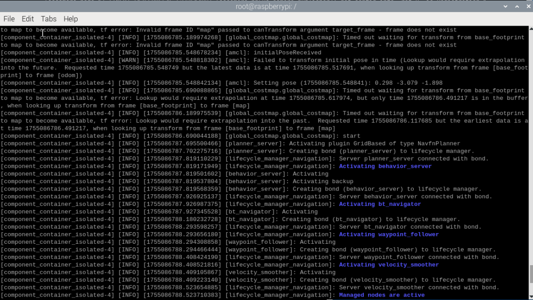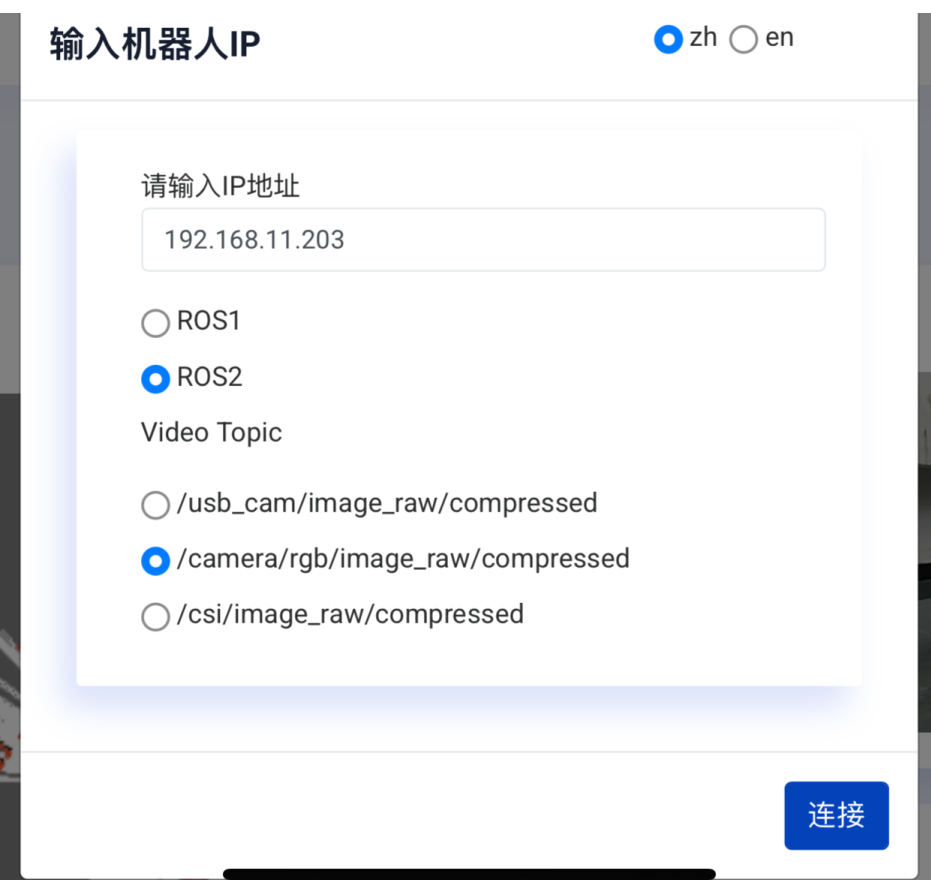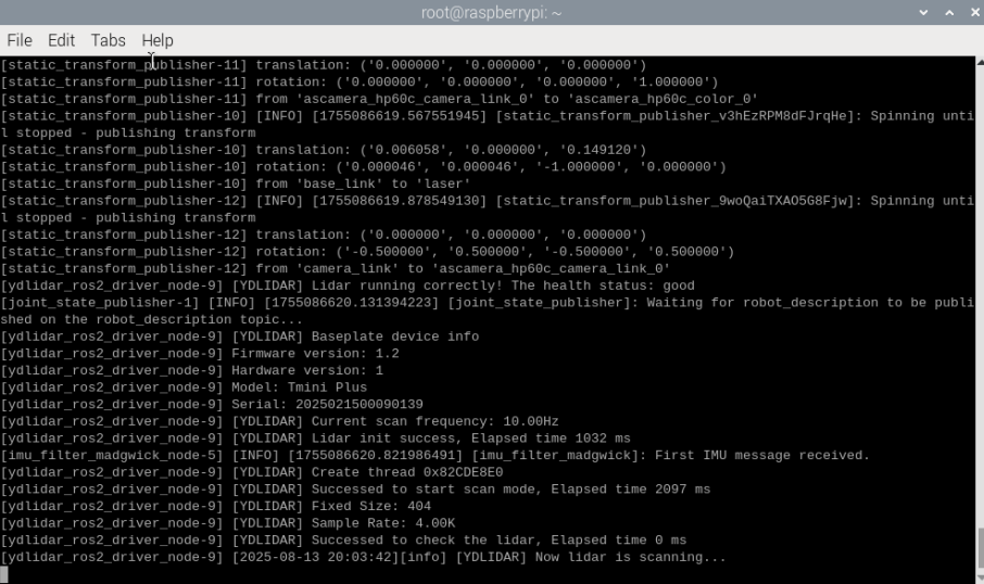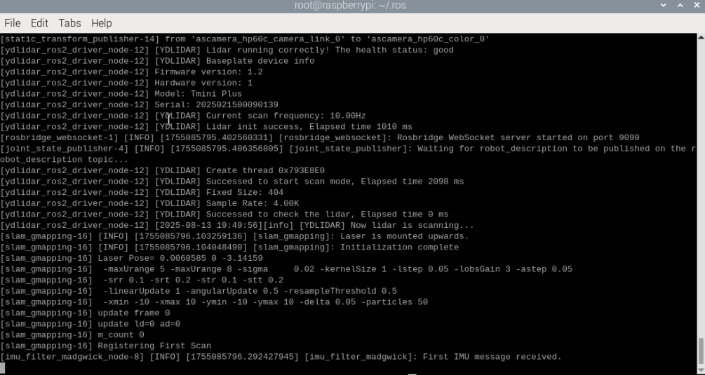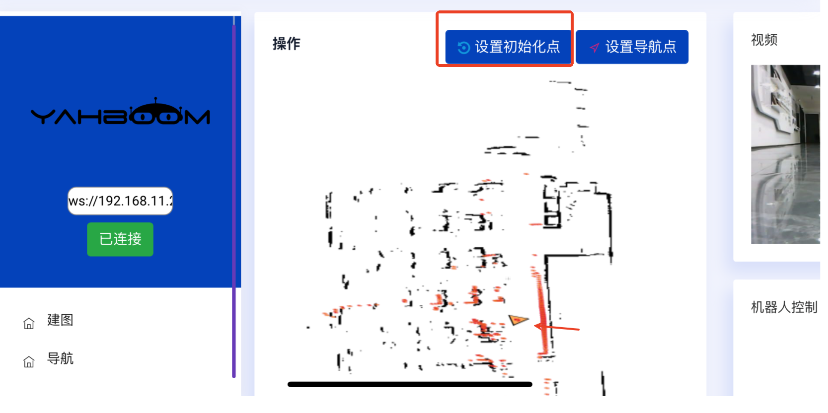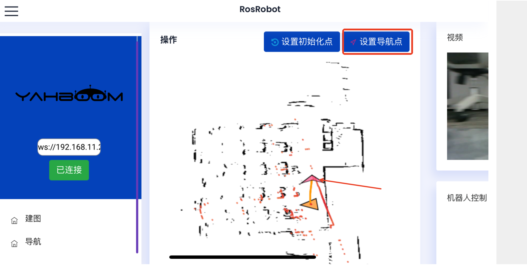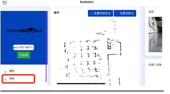 ## 手机APP建图与导航 ### 1、内容说明 本课程说明了如何用【ROS Robot】APP来控制小车进行建图和导航。 本节内容需要在终端中输入指令,这里根据主板类型来选择打开终端。我们直接打开终端,输入本节课程提及的指令即可。 #### 1.1、准备工作 手机需要先下载【ROS Rotbot】的APP。Android/iOS手机用户请扫描二维码下载遥控软件。iOS用户也可在Appstore苹果应用商城搜索并下载建图导航APP【ROSRobot】  然后小车与手机要在同一个局域网下,这个可以通过连接同一个wifi来实现。 ### 2、APP建图 #### 2.1、程序启动 在小车终端上输入以下指令启动小车APP建图 ``` ros2 launch yahboomcar_depth camera_app.launch.py ```  ``` #建图算法二选一 ros2 launch yahboomcar_nav map_gmapping_app_launch.xml ros2 launch yahboomcar_nav map_cartographer_app_launch.xml ```  手机APP显示如下图,输入小车的IP地址,【zh】表示中文,【en】表示英文;选择ROS2,下边的VideoTpoic选择/camera/rgb/image_raw/compressed最后点击【连接】,  成功连接上后,显示如下  通过滑动轮盘控制小车缓慢移动走完需要建图的区域,然后点击保存地图,输入地图名字点击提交,即可保存地图  地图保存的位置是 `~/yahboomcar_ros2_ws/yahboomcar_ws/src/yahboomcar_nav/maps`  #### 2.2、启动指令解析 代码路径: ` ~/yahboomcar_ros2_ws/yahboomcar_ws/src/yahboomcar_nav/launch/map_gmapping_app_launch.xml ` 以map_gmapping_app_launch.xml文件为例,说明启动了哪些launch文件,map_gmapping_app_launch.xml文件如下, ``` <launch> <arg name="use_rviz" default="false" /> <include file="$(find-pkg-share rosbridge_server)/launch/rosbridge_websocket_launch.xml"/> <node name="laserscan_to_point_publisher" pkg="laserscan_to_point_publisher" exec="laserscan_to_point_publish"/> <include file="$(find-pkg-share yahboomcar_nav)/launch/map_gmapping_launch.py"> <arg name="use_rviz" value="$(var use_rviz)"/> </include> <include file="$(find-pkg-share robot_pose_publisher_ros2)/launch/robot_pose_publisher_launch.py"/> <include file="$(find-pkg-share yahboomcar_app_save_map)/yahboom_app_save_map.launch.py"/> </launch> ``` rosbridge_websocket_launch.xml:用于启动 ROS (Robot Operating System) 的 rosbridge WebSocket 服务器 laserscan_to_point_publisher:发布雷达点云数据到app上的节点 map_gmapping_launch:Gmapping建图相关节点 robot_pose_publisher_launch.py:小车位置信息发布节点 yahboom_app_save_map.launch.py:保存地图节点 ### 3、APP导航 #### 3.1、程序启动 在小车终端上输入以下指令启动小车底盘+雷达 ``` ros2 launch yahboomcar_nav laser_bringup_launch.py ```  在小车终端上输入以下指令启动相机, ``` #启动相机 #nuwa ros2 launch yahboomcar_depth camera_app.launch.py ```  在小车终端上输入以下指令启动APP导航, **如果需要使用快速重定位导航需要先按照教程【激光雷达、cartographer建图】保存一张pbstream格式地图和一张yaml格式地图** ``` #导航二选一 #1.正常定位导航(二选一) #dwa ros2 launch yahboomcar_nav navigation_dwa_app_launch.xml #teb ros2 launch yahboomcar_nav navigation_teb_app_launch.xml #2.快速重定位导航 #2.1定位 #ORIN主板 ros2 launch yahboomcar_nav localization_imu_odom.launch.py use_rviz:=false load_state_filename:=/home/jetson/yahboomcar_ros2_ws/yahboomcar_ws/src/yahboomcar_nav/maps/yahboomcar.pbstream #2.2导航 #ORIN主板 ros2 launch yahboomcar_nav navigation_cartodwb_app_launch.xml maps:=/home/jetson/yahboomcar_ros2_ws/yahboomcar_ws/src/yahboomcar_nav/maps/yahboomcar.yaml ``` 以普通定位导航为例  手机APP显示如下图,输入小车的IP地址,【zh】表示中文,【en】表示英文;选择ROS2,下下边的VideoTpoic选择/camera/rgb/image_raw/compressed最后点击【连接】,  成功连接上后,如下图所示,选择导航界面,  然后,结合小车在实际中的位姿,点击【设置初始化点】,给定小车一个初始的目标点,雷达扫描的区域与实际障碍物大致重合则表示位姿准确。如下图所示,  然后,点击【设置导航点】,给定小车一个目的地,小车会规划出路径并且按照路径运动到目的地。如下图所示,  #### 3.2、指令解析 代码路径: `~/yahboomcar_ros2_ws/yahboomcar_ws/src/yahboomcar_nav/launch/navigation_teb_app_launch.xml` 以navigation_teb_app_launch.xml文件为例,说明启动了哪些launch文件,navigation_teb_app_launch.xml文件如下, ``` <launch> <include file="$(find-pkg-share rosbridge_server)/launch/rosbridge_websocket_launch.xml"/> <node name="laserscan_to_point_publisher" pkg="laserscan_to_point_publisher" exec="laserscan_to_point_publish"/> <include file="$(find-pkg-share yahboomcar_nav)/launch/navigation_teb_launch.py"/> <include file="$(find-pkg-share robot_pose_publisher_ros2)/launch/robot_pose_publisher_launch.py"/> </launch> ``` rosbridge_websocket_launch.xml:用于启动 ROS (Robot Operating System) 的 rosbridge WebSocket 服务器 laserscan_to_point_publisher:发布雷达点云数据到app上的节点 robot_pose_publisher_launch.py:小车位置信息发布节点 app_send_goal:app发布导航目标点话题节点 navigation_teb_launch.py:navi2导航相关程序