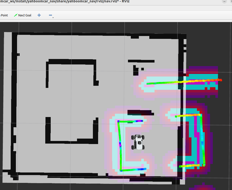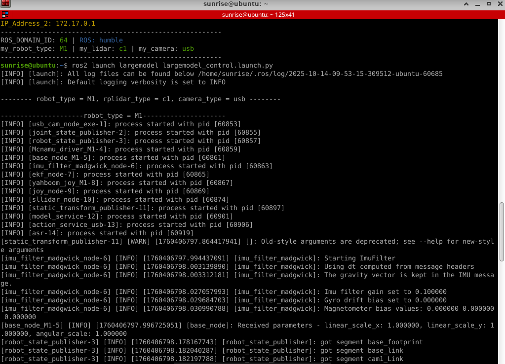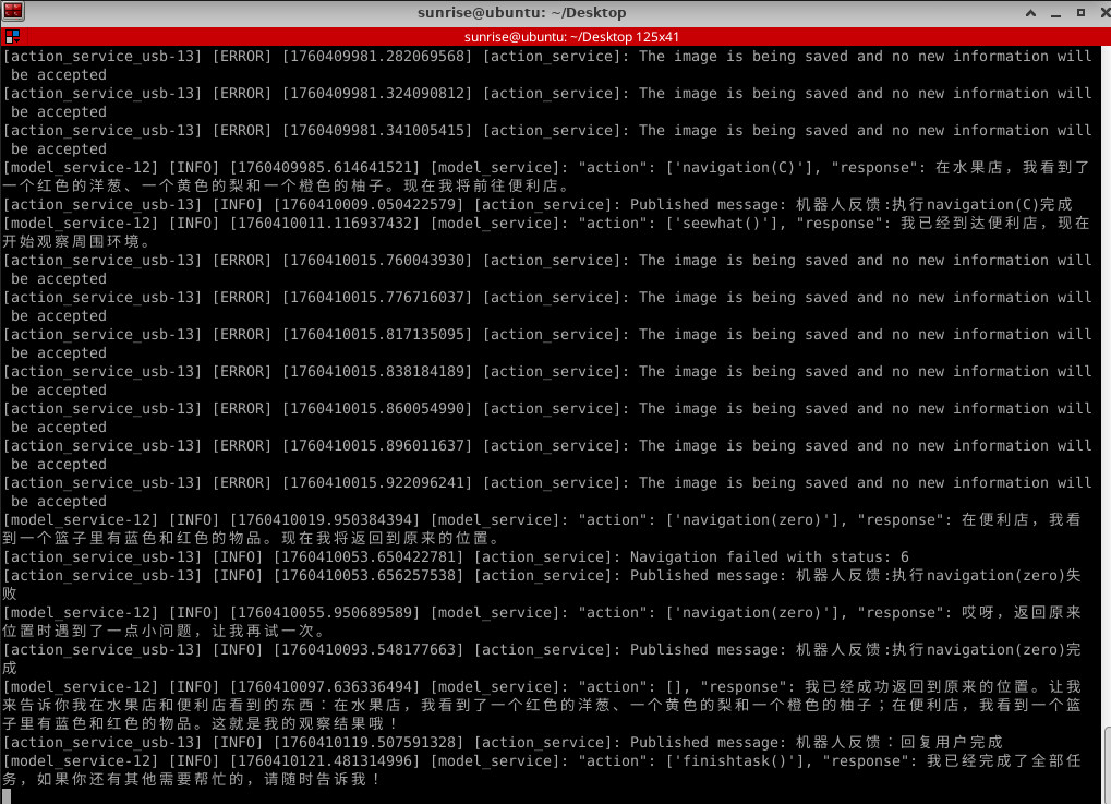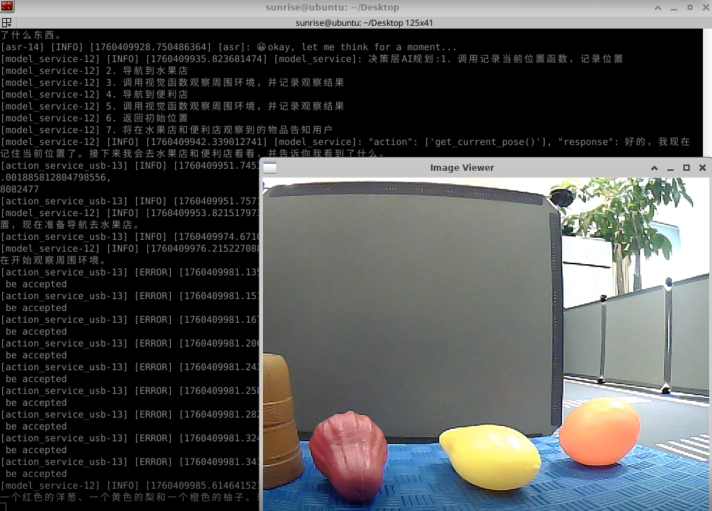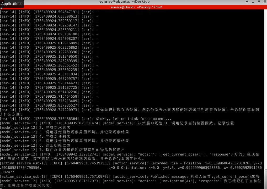 ## 1.课程内容 1.学习在沙盘地图上使用机器人的视觉理解与SLAM导航结合的功能 ## 2.准备工作  ### 2.1 内容说明 直接打开终端,输入本节课程提及的指令即可。 ⚠️ 同样的测试指令,大模型回复的内容不会完全相同,和教程中截图会略有差异,如果需要增强或减弱大模型回复的多样性,参考【AI大模型基础知识】-【配置AI大模型】课程中配置决策层大模型参数部分。 ### 2.2 配置地图映射文件 地图映射的原理和概念详见【AI大模型基础知识】-【具身智能机器人系统架构】章节课程内容 运行此案例前,需要根据【激光雷达课程】-【5.6.7其一建图算法】建图并且保存地图,得到.yaml地图文件 打开终端输入命令, ```车端输入 ros2 launch yahboomcar_nav laser_bringup_launch.py ``` ```虚拟机输入 ros2 launch yahboomcar_nav display_nav_launch.py ``` 等待导航算法开启即可出图,再打开终端输入 #导航算法二选一 #普通导航 ```普通导航 虚拟机输入 ros2 launch yahboomcar_nav navigation_teb_launch.py ``` ```快速重定位导航(第一命令)虚拟机输入 ros2 launch yahboomcar_nav localization_imu_odom.launch.py use_rviz:=false load_state_filename:=/home/sunrise/yahboomcar_ros2_ws/yahboomcar_ws/src/yahboomcar_nav/maps/yahboomcar.pbstream ``` ```快速重定位导航(第二命令,输入完第一命令,新建终端再输入)虚拟机输入 ros2 launch yahboomcar_nav navigation_cartodwb_launch.py maps:=/home/jetson/yahboomcar_ros2_ws/yahboomcar_ws/src/yahboomcar_nav/maps/yahboomcar.yaml params_file:=/home/jetson/yahboomcar_ros2_ws/yahboomcar_ws/src/yahboomcar_nav/params/cartoteb_nav_params.yaml ``` **注:【快速重定位导航】此处yahboomcar.yaml必须和yahboomcar.pbstream是同时完成建图的,即是同一个地图,参考cartograph建图算法保存地图** 之后会在rviz2的出现地图可视化界面,点击上方工具栏中的**2D Pose Estimate**,进入选择状态,在地图上大致标出具机器人所在的位置和朝向 机器人的模型会在地图中显示,如下图所示:  在虚拟机中再次新建一个终端,输入命令 ```虚拟机输入 ros2 topic list ```  可以看到有**/initialpose**话题,该话题为为上一步在rviz2中使用**2D Pose Estimate**工具发布话题,我们可以借助该工具发布坐标查看**/initialpose**话题的数据获取到地图中某个点位的坐标和朝向角 在终端输入以下命令,即可观察到**/initialpose**话题上的数据 ```虚拟机输入 ros2 topic echo /initialpose ``` 我们可以给地图中任意一个点位命名,这里以图示命名举例  如下图所示,我们先点击**2D Pose Estimate**工具,然后在"水果店"区域任选一个地方鼠标左键点击不松手,可以调整朝向,确定后松手  机器人位置会调整到刚才选定的位置和朝向,在rviz中可以预览机器人预计的位置和朝向  在终端窗口的最后一帧信息中可以看到刚才我们通过**2D Pose Estimate**工具标出的目标点的的坐标  打开map_mapping.yaml地图映射文件,文件位于: /home/jetson/yahboomcar_ros2_ws/yahboomcar_ws/src/largemodel/config/map_mapping.yaml 将其中的A中的"name"替换成"水果店"、"position"、"orientation"数据替换成终端中**/initialpose**话题刚才我们看到的数据 #根据实际的场景环境,自定义地图中的区域,可以添加任意个区域,注意和大模型的地图映射保持一致即可 ``` #According to the actual scene environment, customize the areas in the map. You can add any number of areas, just make sure they are consistent with the map mapping of the large model #地图映射Map mapping A: name: '水果店' position: x: 1.339120626449585 y: -0.4776395797729492 z: 0.0 orientation: x: 0.0 y: 0.0 z: 0.7038725577603971 w: 0.7103262788548911 #此处可新增添加区域对应的栅格地图坐标点,注意和上面格式保持一致 #Here, you can add the raster map coordinate points corresponding to the added area. Please note that the format should be consistent with the above ``` 按照同样的方式,我们可以增加"盆栽店"的地图映射 ``` #根据实际的场景环境,自定义地图中的区域,可以添加任意个区域,注意和大模型的地图映射保持一致即可 #According to the actual scene environment, customize the areas in the map. You can add any number of areas, just make sure they are consistent with the map mapping of the large model #地图映射Map mapping A: name: '水果店' position: x: 1.339120626449585 y: -0.4776395797729492 z: 0.0 orientation: x: 0.0 y: 0.0 z: 0.7038725577603971 w: 0.7103262788548911 B: name: '盆栽店' position: x: -0.0008649379014968872 y: 0.4937915802001953 z: 0.0 orientation: x: 0.0 y: 0.0 z: 0.7133229968132297 w: 0.7008354316224266 • #此处可新增添加区域对应的栅格地图坐标点,注意和上面格式保持一致 #Here, you can add the raster map coordinate points corresponding to the added area. Please note that the format should be consistent with the above ``` 然后在终端切换到`/yahboomcar_ros2_ws/yahboomcar_ws#/`工作空间下:重新编译largemodel功能包生效配置 重新编译功能包: ``` colcon build --packages-select largemodel ```  ## 3.运行案例 ### 3.1 启动程序 打开终端输入命令: ``` ros2 launch largemodel largemodel\_control.launch.py ```  新建一个终端启动 ``` ros2 launch yahboomcar_nav display_nav_launch.py ``` 等待导航算法开启即可出图,再打开终端输入 ``` #导航算法二选一 #普通导航 ros2 launch yahboomcar_nav navigation_teb_launch.py #快速重定位导航 (RDKX5、树莓派5、jetsonnano主控不支持) ros2 launch yahboomcar_nav localization_imu_odom.launch.py use_rviz:=false load_state_filename:=/home/jetson/yahboomcar_ros2_ws/yahboomcar_ws/src/yahboomcar_nav/maps/yahboomcar.pbstream ros2 launch yahboomcar_nav navigation_cartodwb_launch.py maps:=/home/jetson/yahboomcar_