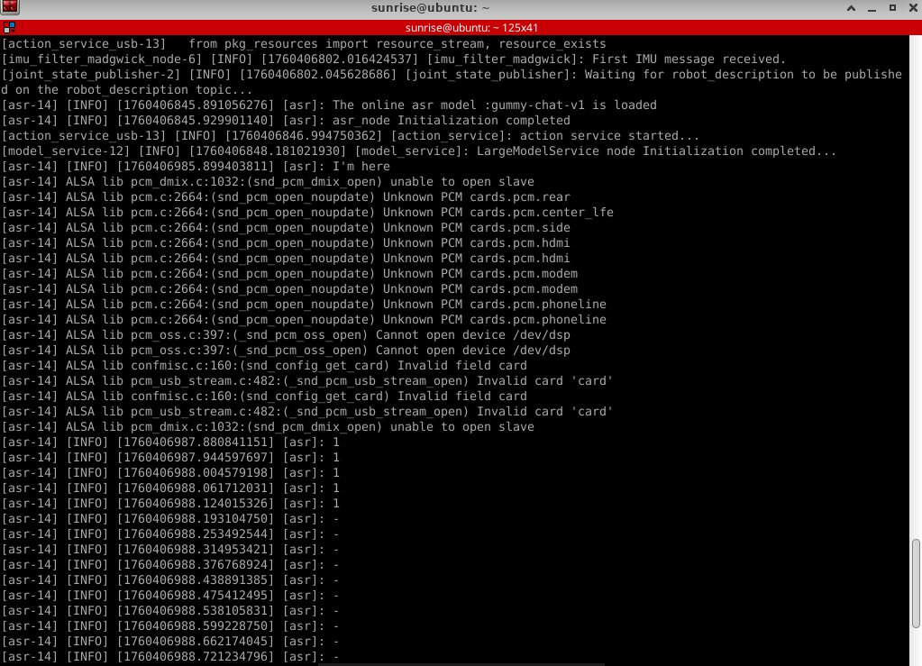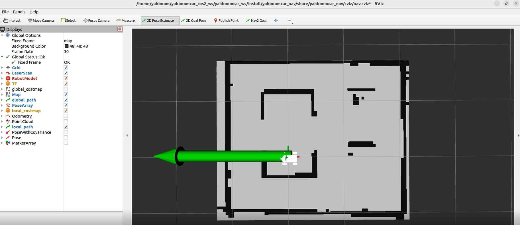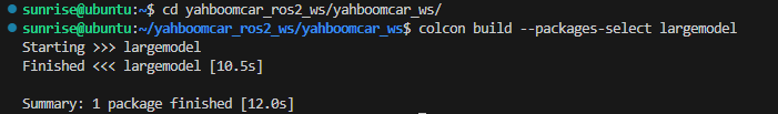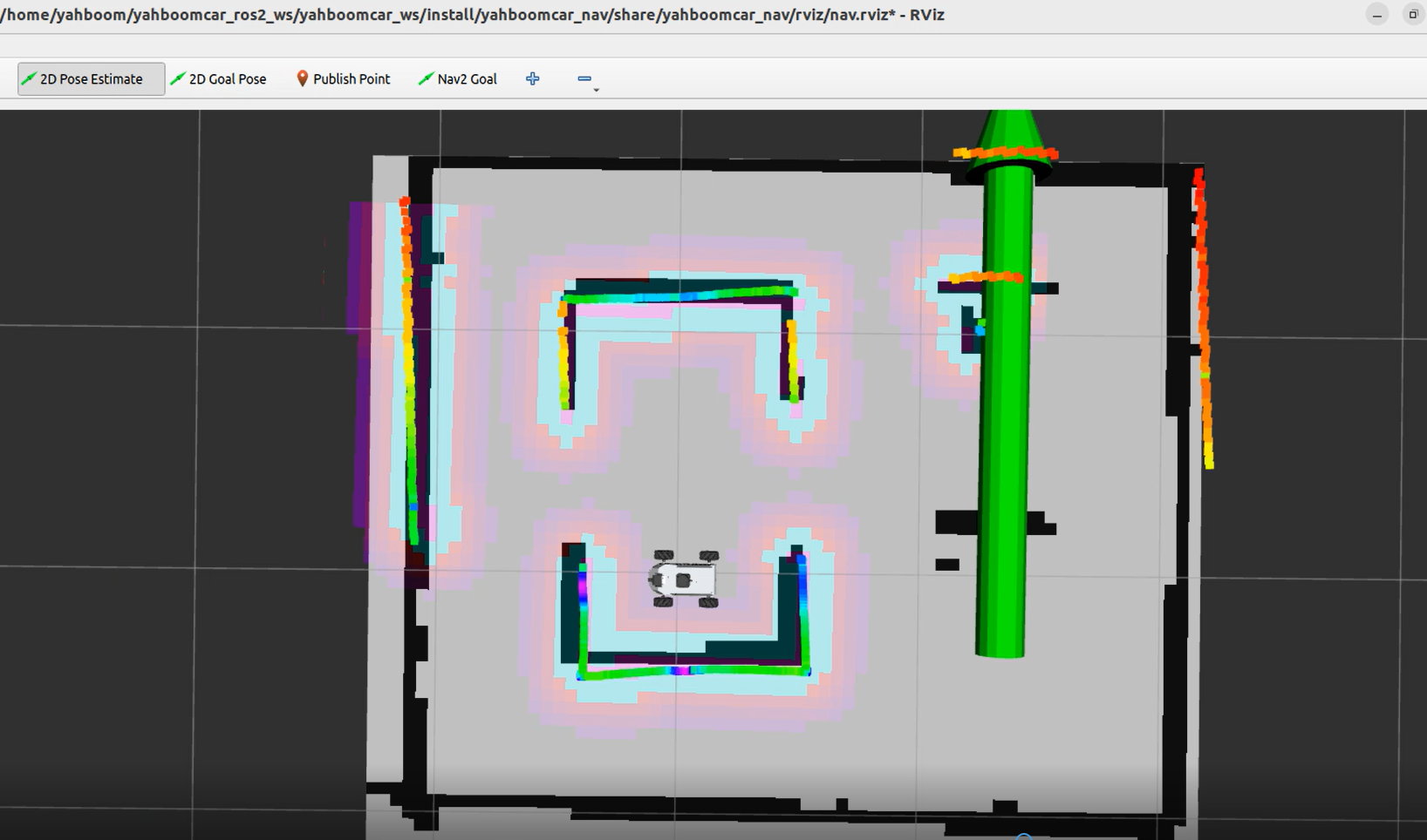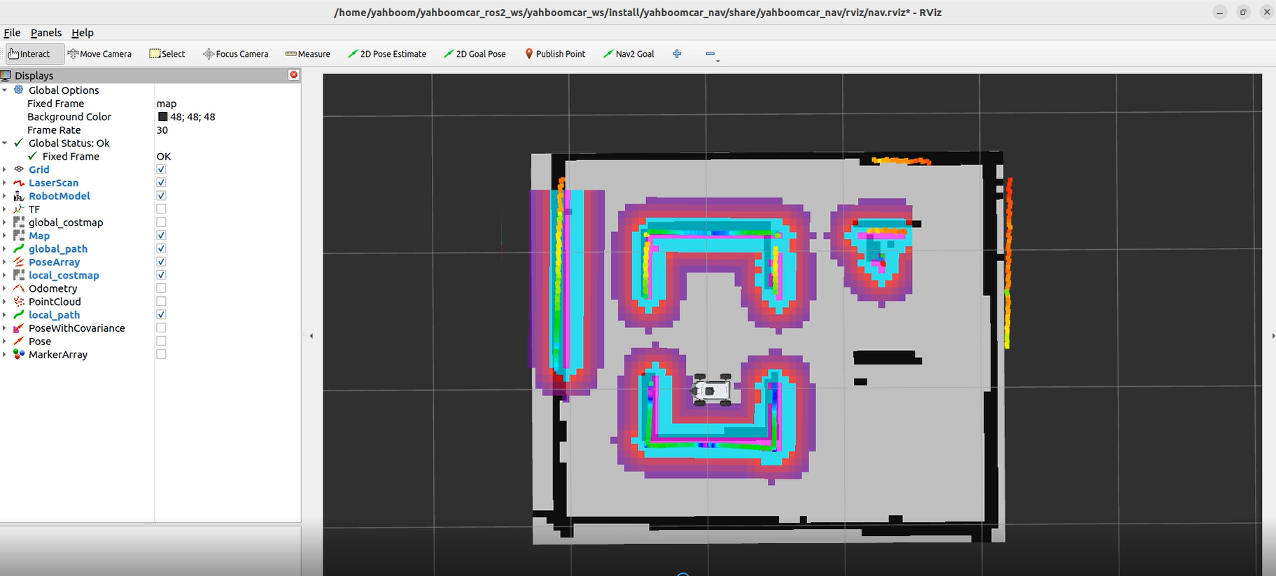 ## 1.课程内容 1.学习在沙盘地图上使用机器人的视觉理解与SLAM导航结合的功能 ## 2.准备工作  ### 2.1 内容说明 直接打开终端,输入本节课程提及的指令即可。 ⚠️ 同样的测试指令,大模型回复的内容不会完全相同,和教程中截图会略有差异,如果需要增强或减弱大模型回复的多样性,参考【AI大模型基础知识】-【配置AI大模型】课程中配置决策层大模型参数部分。 ### 2.2 配置地图映射文件 地图映射的原理和概念详见【AI大模型基础知识】-【具身智能机器人系统架构】章节课程内容 运行此案例前,需要根据【激光雷达课程】-【5.6.7其一建图算法】建图并且保存地图,得到.yaml地图文件 打开终端输入命令, ```车端输入 ros2 launch yahboomcar_nav laser_bringup_launch.py ``` ```虚拟机输入 ros2 launch yahboomcar_nav display_nav_launch.py ``` 等待导航算法开启即可出图,再打开终端输入 #导航算法二选一 #普通导航 ```普通导航 虚拟机输入 ros2 launch yahboomcar_nav navigation_teb_launch.py ``` ```快速重定位导航(第一命令)虚拟机输入 ros2 launch yahboomcar_nav localization_imu_odom.launch.py use_rviz:=false load_state_filename:=/home/sunrise/yahboomcar_ros2_ws/yahboomcar_ws/src/yahboomcar_nav/maps/yahboomcar.pbstream ``` ```快速重定位导航(第二命令,输入完第一命令,新建终端再输入)虚拟机输入 ros2 launch yahboomcar_nav navigation_cartodwb_launch.py maps:=/home/jetson/yahboomcar_ros2_ws/yahboomcar_ws/src/yahboomcar_nav/maps/yahboomcar.yaml params_file:=/home/jetson/yahboomcar_ros2_ws/yahboomcar_ws/src/yahboomcar_nav/params/cartoteb_nav_params.yaml ``` **注:【快速重定位导航】此处yahboomcar.yaml必须和yahboomcar.pbstream是同时完成建图的,即是同一个地图,参考cartograph建图算法保存地图** 之后会在rviz2的出现地图可视化界面,点击上方工具栏中的**2D Pose Estimate**,进入选择状态,在地图上大致标出具机器人所在的位置和朝向 机器人的模型会在地图中显示,如下图所示:  在虚拟机中再次新建一个终端,输入命令 ```虚拟机输入 ros2 topic list ```  可以看到有**/initialpose**话题,该话题为为上一步在rviz2中使用**2D Pose Estimate**工具发布话题,我们可以借助该工具发布坐标查看**/initialpose**话题的数据获取到地图中某个点位的坐标和朝向角 在终端输入以下命令,即可观察到**/initialpose**话题上的数据 ```虚拟机输入 ros2 topic echo /initialpose ``` 我们可以给地图中任意一个点位命名,这里以图示命名举例  如下图所示,我们先点击**2D Pose Estimate**工具,然后在"水果店"区域任选一个地方鼠标左键点击不松手,可以调整朝向,确定后松手  机器人位置会调整到刚才选定的位置和朝向,在rviz中可以预览机器人预计的位置和朝向  在终端窗口的最后一帧信息中可以看到刚才我们通过**2D Pose Estimate**工具标出的目标点的的坐标  打开map_mapping.yaml地图映射文件,文件位于: /home/jetson/yahboomcar_ros2_ws/yahboomcar_ws/src/largemodel/config/map_mapping.yaml 将其中的A中的"name"替换成"水果店"、"position"、"orientation"数据替换成终端中**/initialpose**话题刚才我们看到的数据 #根据实际的场景环境,自定义地图中的区域,可以添加任意个区域,注意和大模型的地图映射保持一致即可 ``` #According to the actual scene environment, customize the areas in the map. You can add any number of areas, just make sure they are consistent with the map mapping of the large model #地图映射Map mapping A: name: '水果店' position: x: 1.339120626449585 y: -0.4776395797729492 z: 0.0 orientation: x: 0.0 y: 0.0 z: 0.7038725577603971 w: 0.7103262788548911 #此处可新增添加区域对应的栅格地图坐标点,注意和上面格式保持一致 #Here, you can add the raster map coordinate points corresponding to the added area. Please note that the format should be consistent with the above ``` 按照同样的方式,我们可以增加"盆栽店"的地图映射 ``` #根据实际的场景环境,自定义地图中的区域,可以添加任意个区域,注意和大模型的地图映射保持一致即可 #According to the actual scene environment, customize the areas in the map. You can add any number of areas, just make sure they are consistent with the map mapping of the large model #地图映射Map mapping A: name: '水果店' position: x: 1.339120626449585 y: -0.4776395797729492 z: 0.0 orientation: x: 0.0 y: 0.0 z: 0.7038725577603971 w: 0.7103262788548911 B: name: '盆栽店' position: x: -0.0008649379014968872 y: 0.4937915802001953 z: 0.0 orientation: x: 0.0 y: 0.0 z: 0.7133229968132297 w: 0.7008354316224266 • #此处可新增添加区域对应的栅格地图坐标点,注意和上面格式保持一致 #Here, you can add the raster map coordinate points corresponding to the added area. Please note that the format should be consistent with the above ``` 然后在终端切换到`/yahboomcar_ros2_ws/yahboomcar_ws#/`工作空间下:重新编译largemodel功能包生效配置 重新编译功能包: ``` colcon build --packages-select largemodel ```  ## 3.运行案例 ### 3.1 启动程序 打开终端输入命令: ``` ros2 launch largemodel largemodel\_control.launch.py ```  新建一个终端启动 ``` ros2 launch yahboomcar_nav display_nav_launch.py ``` 等待导航算法开启即可出图,再打开终端输入 ``` #导航算法二选一 #普通导航 ros2 launch yahboomcar_nav navigation_teb_launch.py #快速重定位导航 (RDKX5、树莓派5、jetsonnano主控不支持) ros2 launch yahboomcar_nav localization_imu_odom.launch.py use_rviz:=false load_state_filename:=/home/jetson/yahboomcar_ros2_ws/yahboomcar_ws/src/yahboomcar_nav/maps/yahboomcar.pbstream ros2 launch yahboomcar_nav navigation_cartodwb_launch.py maps:=/home/jetson/yahboomcar_